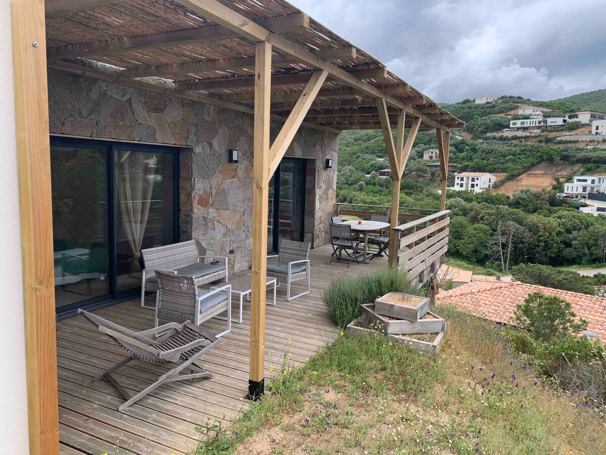 2-bedroom apartment (sleeps 2) in a new 45 m² residence with beautiful view of the Gulf of Ajaccio. It is comfortable, bright, nicely decorated, fully equipped and air-conditioned and has a large 22 m² terrace equipped with garden furniture. PRM access. A 3-minute walk to the first beaches and close to the beaches of PORTICCIO, AGOSTA, RUPPIONE and MARE E SOLE as well as all shops and services. The forest and its hikes overlooking the Gulf are 10 minutes away.