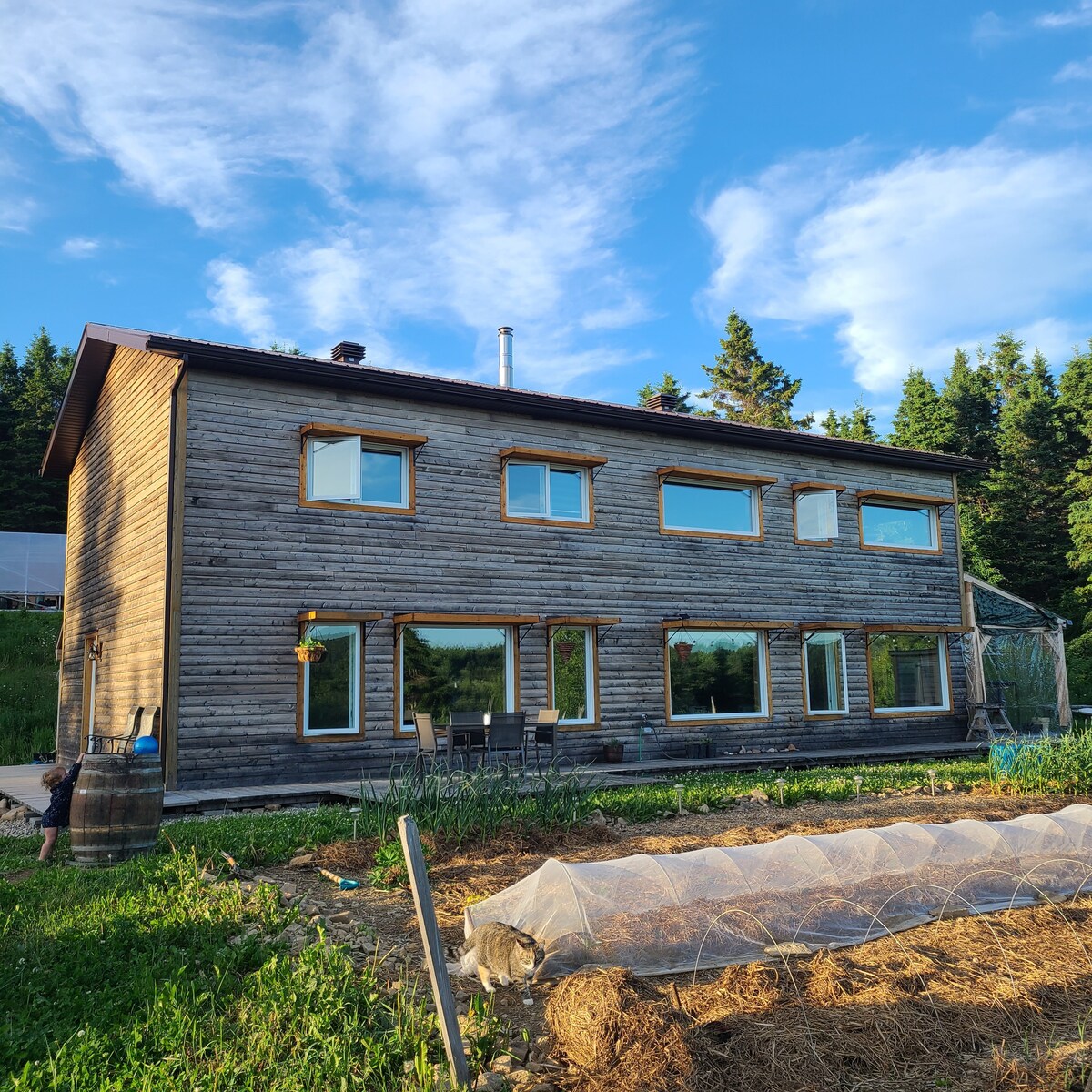 Maison neuve écologique situé sur une ferme biologique en avenir ,centrale entre Gaspé et Percé. La maison est un bigénérationnel. Ma famille et moi habitons le logement adjacent. Style loft avec cuisine et salon tout ouvert. Échangeur d'air dans chaque chambre avec filtre HEPA. Donne sur la 132 avec grand parking. Superbe vue dans un coin sauvage et très tranquille. Tous les shampoings et savons sont offert aucun produit de beauté et autre cosmétique ou de lavages non écologique n'est accepté.