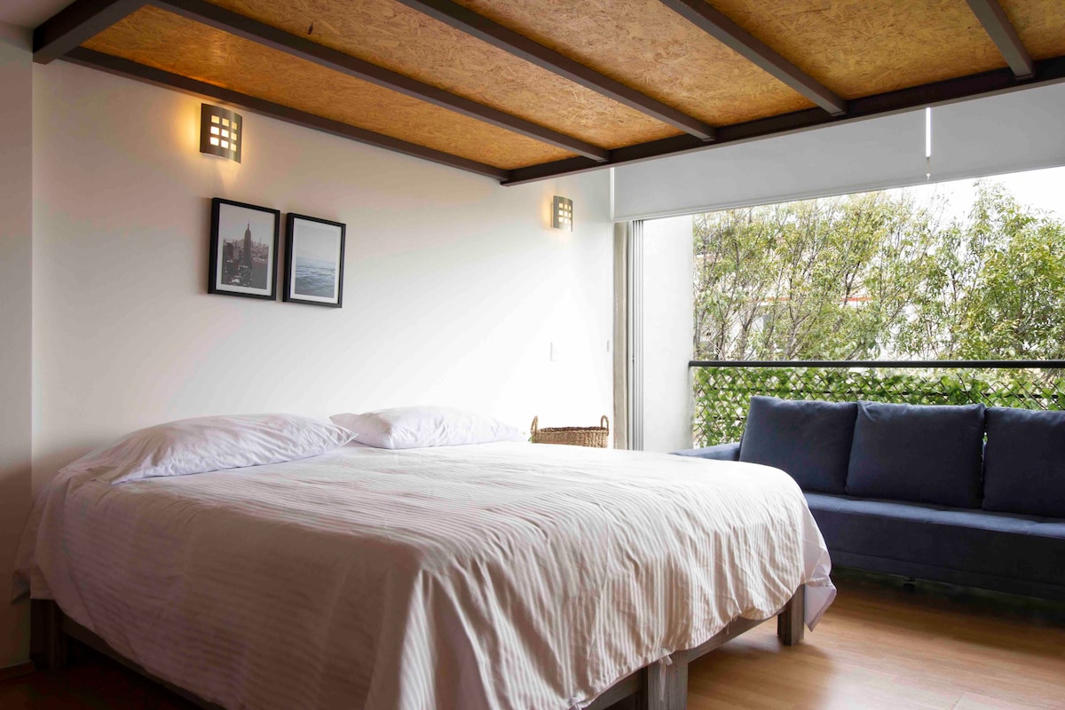 Enjoy this quiet and centrally located place, located at the top and with an unbeatable view and lighting. It has everything you need for a comfortable stay: a double bed and a sofa bed, a fully-equipped kitchen, and a shower. Its location is unbeatable, next to La Condesa and the WTC, surrounded by major avenues and with multiple transportation and mobility options. A few blocks from Plaza Metrópoli. Suitable for business trips or travelers.