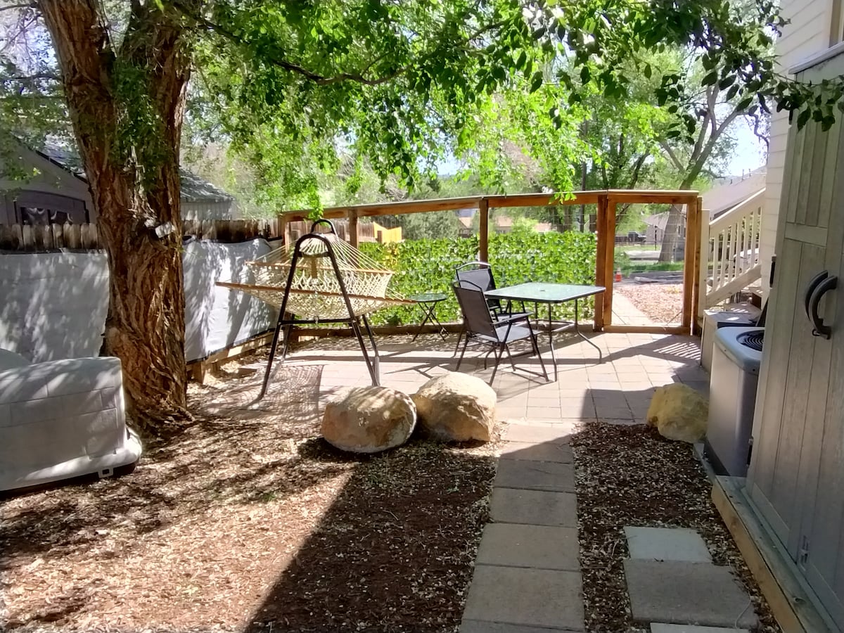 Cozy In-law apt perfect for just one or two people packing a punch: massive shower, fireplace, record player, Roku TV (Hulu/Netflix) & comfiest bed! ★Walk to OTC; Short drive Dwntwn, CC, Pikes Peak, USAFA, UCCS ★YARD: Hot tub, firepit, grill, speaker, yard games, Schwinn bike ★GYM: Peloton, Treadmill & Elliptical. Jump ropes, kettle bells, speaker, Roku TV+MORE! ★DESK: printer, fast WIFI, G00gle Mini & cocktail shaker ★FAMILY: PackNplay, toys, high chair ★Kitchenette: stovetop, blender+more!