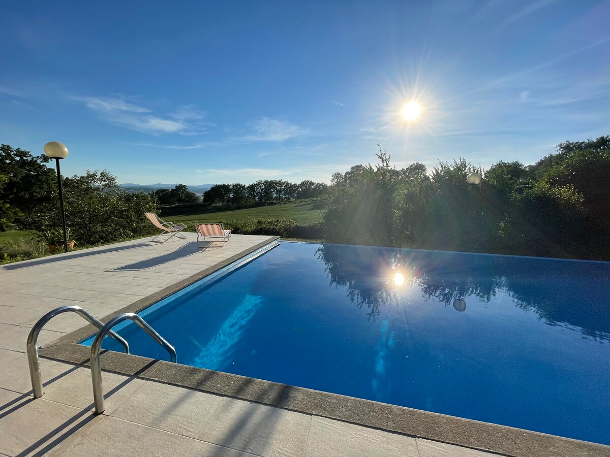 Enchanting, exclusive 10acres estate on a hill, memorable sunsets; large pool framed by lavender&rosemary, open year-round. New air conditioning, Starlink internet. Very private&peaceful 2 floors, 4bedrooms, 4baths, jacuzzibathtub, 55inch smartTV, well-equipped kitchen, porch & pergola for alfresco dining, Weber barbecue, pizza oven, olive grove, fireplace; 20 min. to Orvieto,Todi,Amelia; 10 minutes drive to train station to Rome/Florence, 5min drive to shops in town. Grounds/pool caretaker
