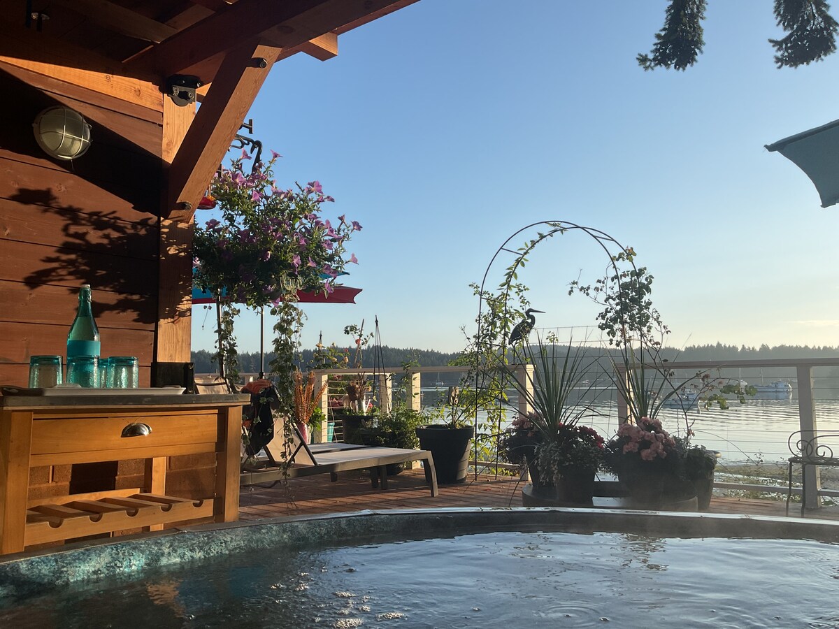 The Hillside Garden Suite , a great place to celebrate that special occasion , a tasty breakfast & latte included at this unique harbour side property, a former Customs House and shellfish cannery. Now restored featuring vaulted ceiling and travertine stone floors, offering modern comfort. Relax in the jacuzzi /sauna/cold plunge barrel on the expansive sea deck, or enjoy a beach BBQ .The suite private deck and entrance are nestled beside the hillside garden and heated gazebo. A memorable stay
