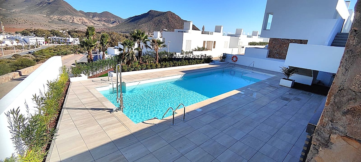 World Biosphere Reserve, 50km of virgin coast, with a fortunate warm and sunny climate all year round. The house is located in the heart of the Cabo de Gata Natural Park to enjoy the silence, fresh air, mountains, and stars. The best pristine beaches nearby: Monsul, Genoveses, Los Escullos... A 5-minute drive to a wide variety of restaurants, shops... The Park is an ecotourism paradise: hiking, kayaking, diving, cycling...