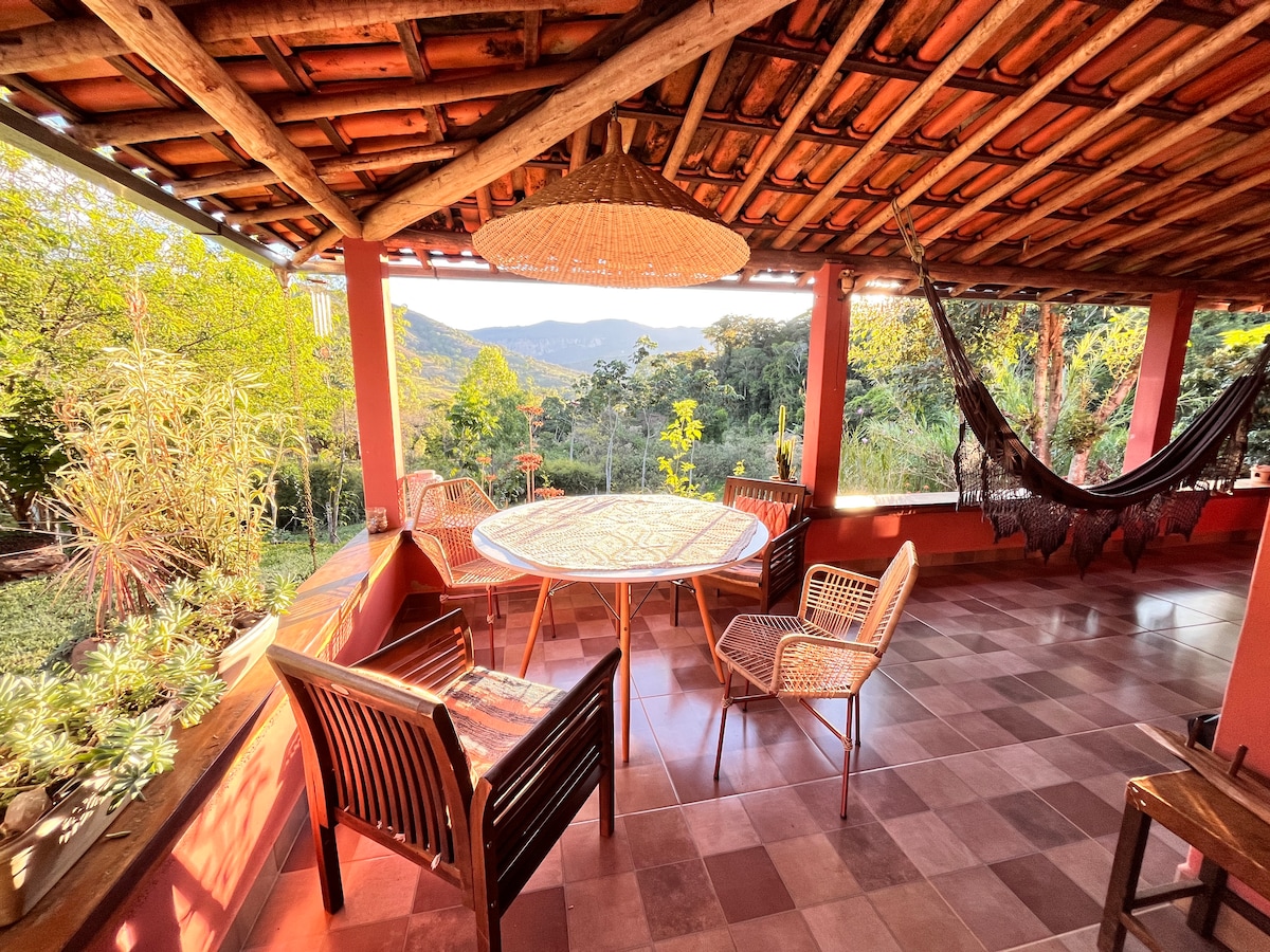 Surrounded by a backyard of cerrado native vegetation, Canto Acá is a cozy one with a beautiful view to the mountains! Aconchega comfortably up to 8 people, 4 on each floor (2 baths). But it is also perfect for couples, smaller groups, due to its special configuration. It has full kitchen, hammocks, external shower to refresh. We leave the house half "transparent" so that the mountains and the moon can enter...but with blackouts in the rooms! 1km from the centrinho. Welcome! Welcome!