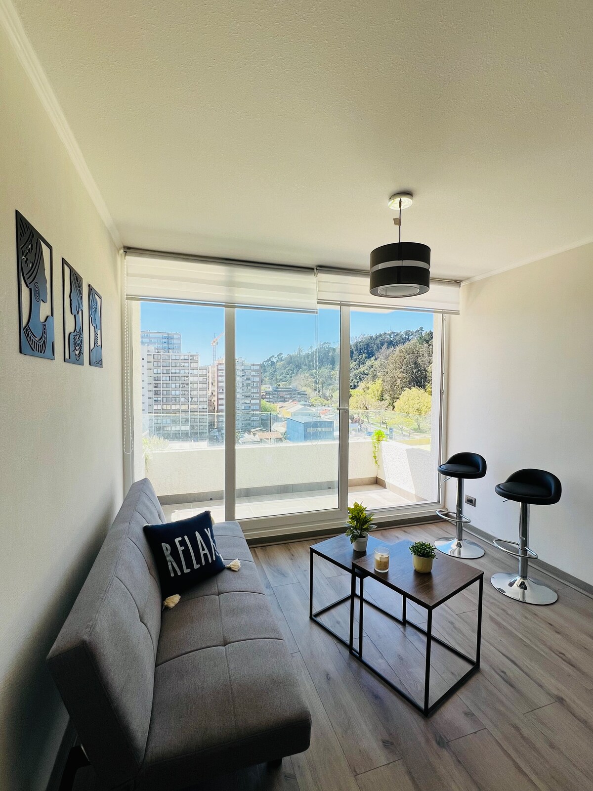 Modern 1-bedroom apartment on the 15th floor with panoramic views of Concepción and unique sunsets 🌇. Bright and cozy space, ideal for relaxing, working, or long stays. Features a comfortable living room 🛋️, fully equipped kitchen 👩🍳, fast Wi-Fi 🛜, TV with Netflix/Disney+ 📺, and a double bed 🛏️. Centrally located, just steps from downtown, universities, restaurants, and public transport 🚍. 🔔 Automatic discounts from 2 nights 😌