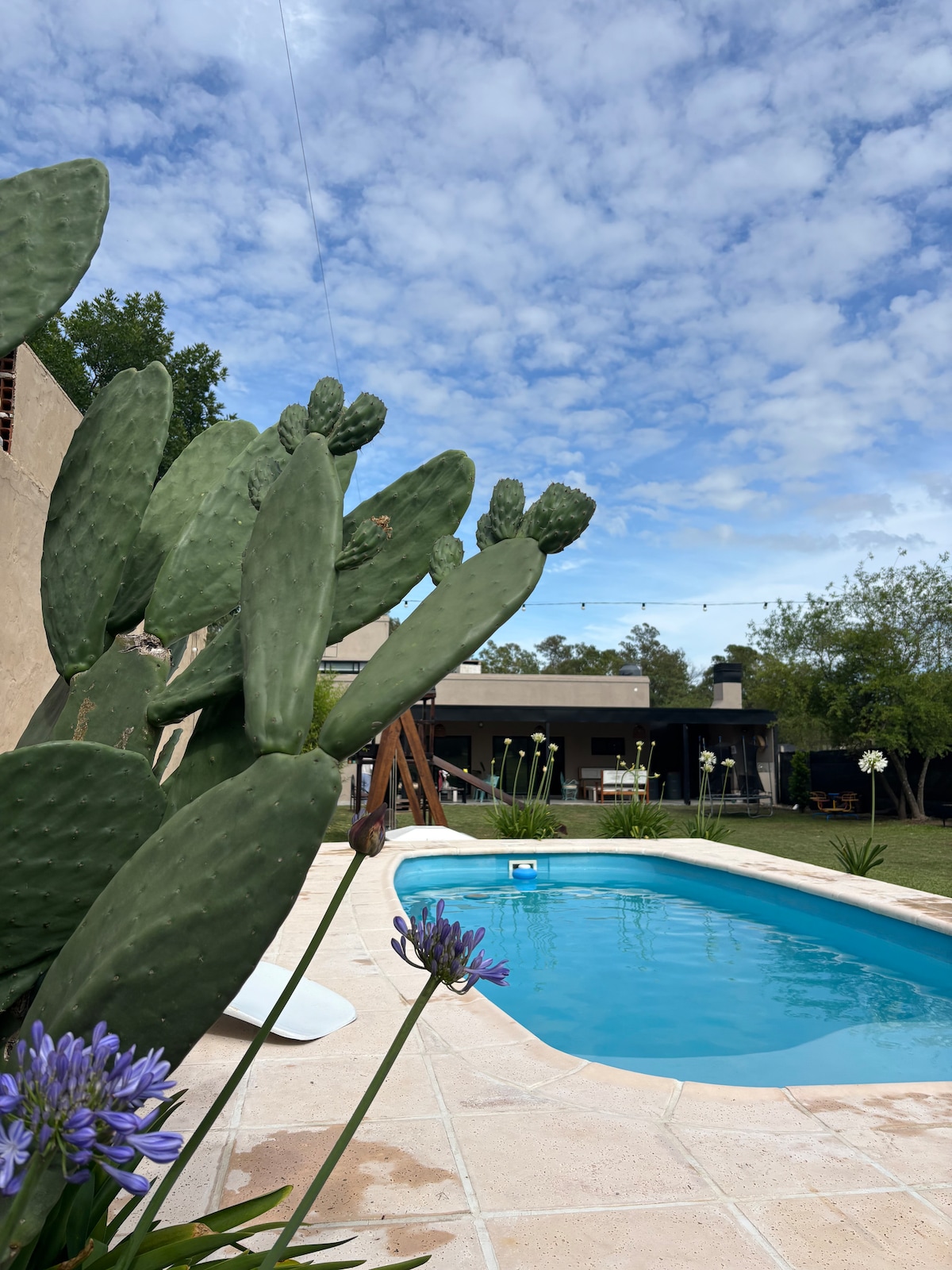 Quinta house with swimming pool and large parked area. 3 bedrooms, two bathrooms. Master bedroom with en-suite bathroom and air conditioning. Secondary rooms with ceiling fan Gallery/quintessential with grill and mud oven Large living/dining room with air conditioning and full kitchen DirecTV, Internet access Microwave, toaster, crockery 8 people Covered garage Automated entrance Apt for 8 people 10 minutes from downtown, 15 minutes to beaches Less than 3 hours from Buenos Aires
