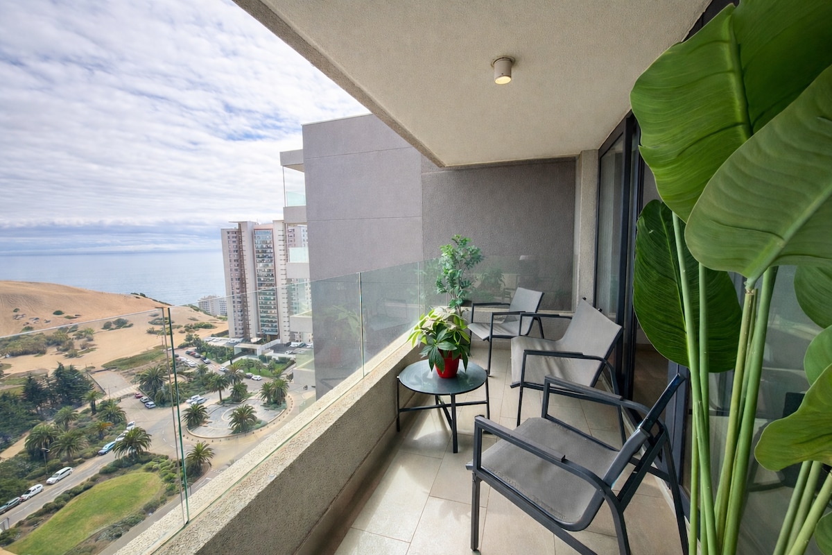Moderno, cómodo, amplio y la mejor panoramica que te puedas imaginar, y todo en el mismo depto!! Con piscinas natural y temperada, gimnasio, areas verdes, pet-friendly. Podras ir caminando a restaurantes, playa, las dunas, minimarket, parques, todo entre 5 a 10 minutos. Piscina exterior opera estacionalmente desde fines de noviembre a fines de marzo.