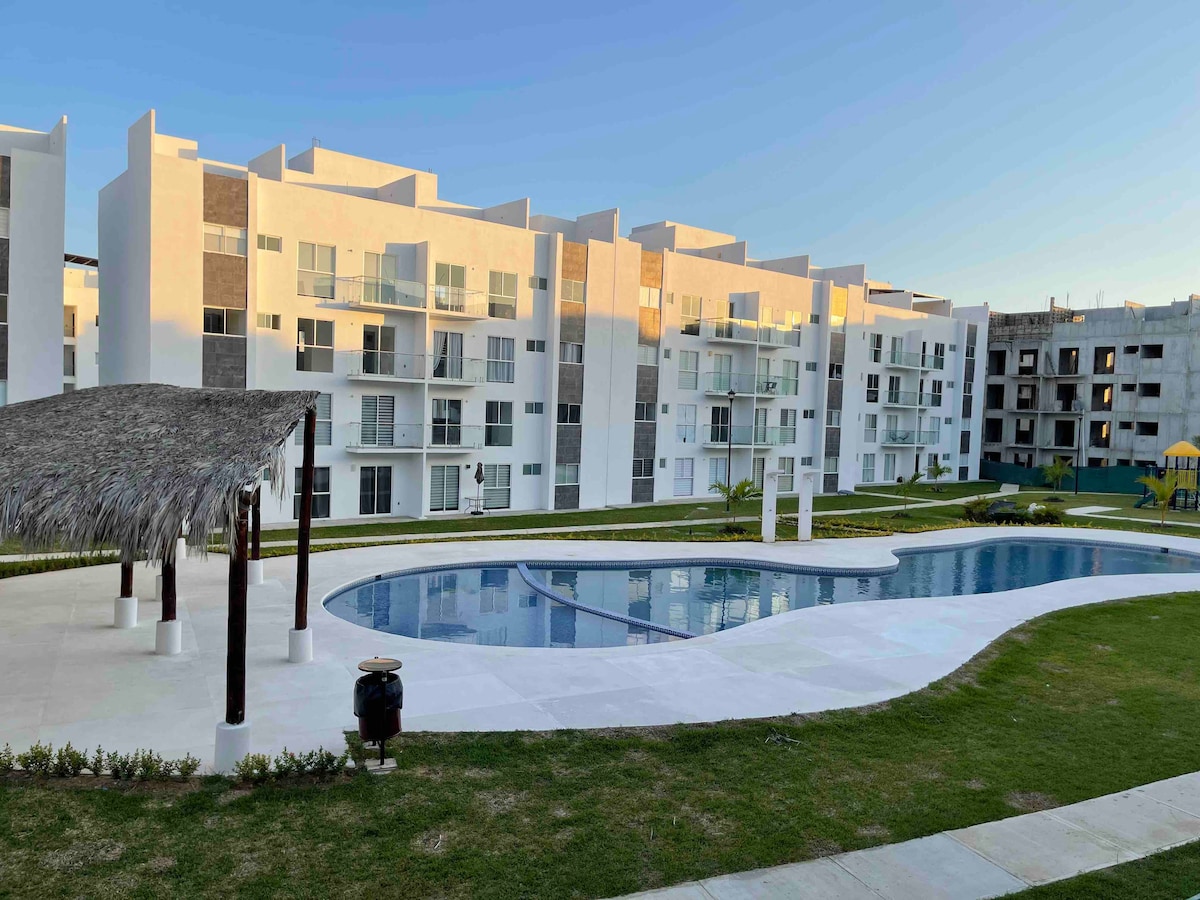 The apartment is located in the diamond zone, the subdivision is new, very quiet and with 24-hour security, come and enjoy a good rest, accompanied by your family, 100% guaranteed. It is recommended that before arriving at the apartment, buy what you need for your pantry at Chedraui Selecto since in the condominium there is an apartment that sells only the essentials such as soft drinks, water, cookies, juices, etc. The beach club is 10 minutes from the apartment.