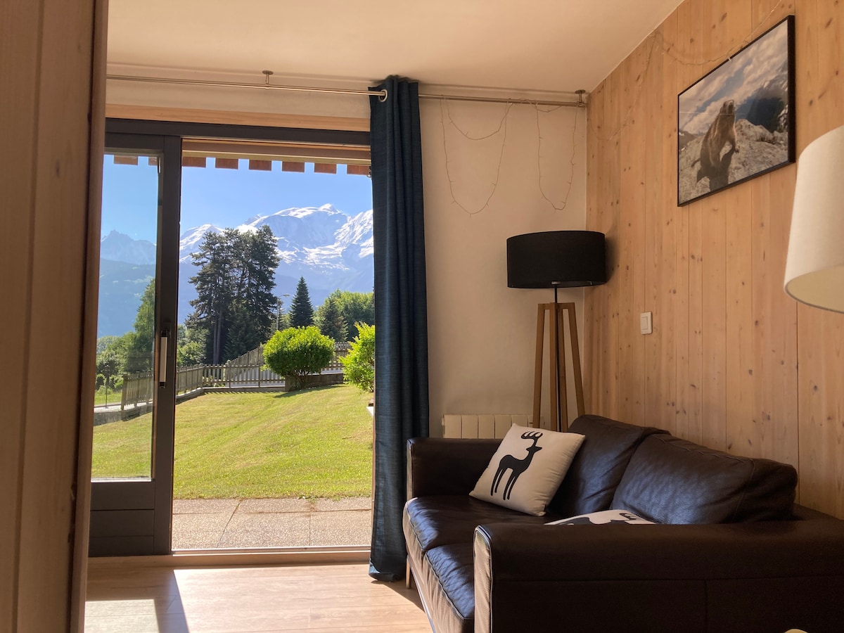 Modern 52 m2 apartment on the ground floor of a mountain chalet, with a great view of the Mont Blanc chain, surrounded by nature, exceptional view, close to the village center and restaurants. My place is good for couples, solo travelers, business travelers, and families. Additional charge if it is a family of 5 with baby (€25-30/pers) Evening meal and breakfast menu (vegetarian and vegan) on request if I am available. coffee maker: Senseo