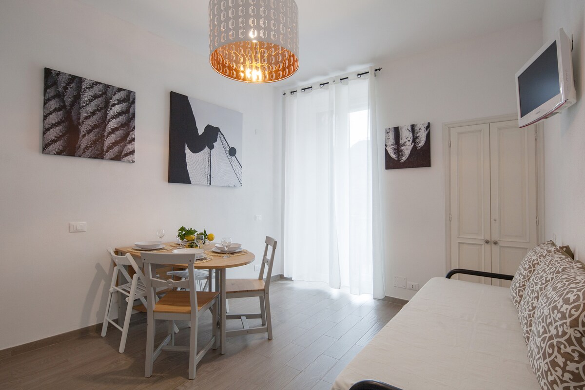 The apartment is a bright and cozy retreat, ideal for couples, families or friends who want to experience the Cinque Terre with calm and comfort. Inside you will find a modern and spacious kitchen equipped to prepare breakfasts, dinners or aperitifs overlooking the sea on the private terrace with sun loungers to relax after returning from your activities. 1 double bedroom equipped with linen and a cot for children In the living room, you will find a sofa bed for 2 people.