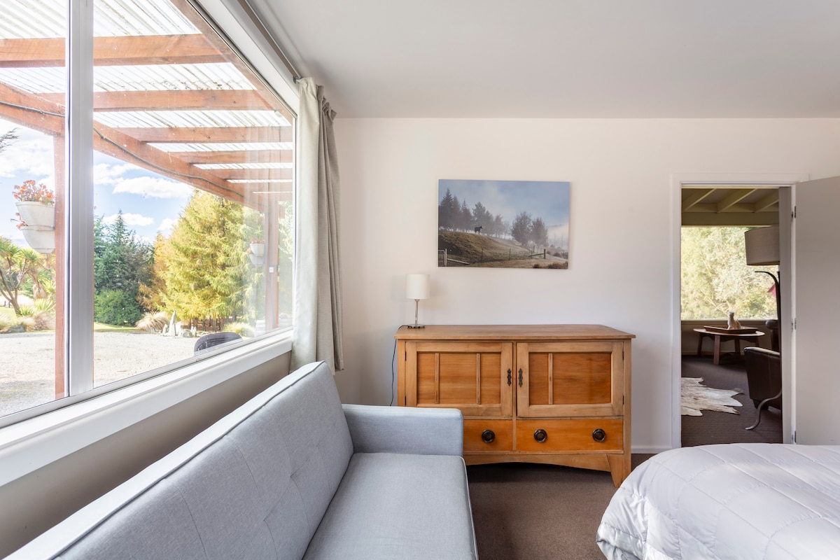 Overlooking the picturesque views of the Crown Range sits Birdwoods Cottage.This self-contained cottage has 1 private Bedroom, Bathroom, Lounge, Kitchenette and Laundry. The space has beautiful natural light and soft warm tones with windows taking advantage of the rural views throughout the cottage. This cottage will make you feel like you have been transported to Africa with the exquisite artwork and sculptures around the cottage and property making this a unique holiday home experience.