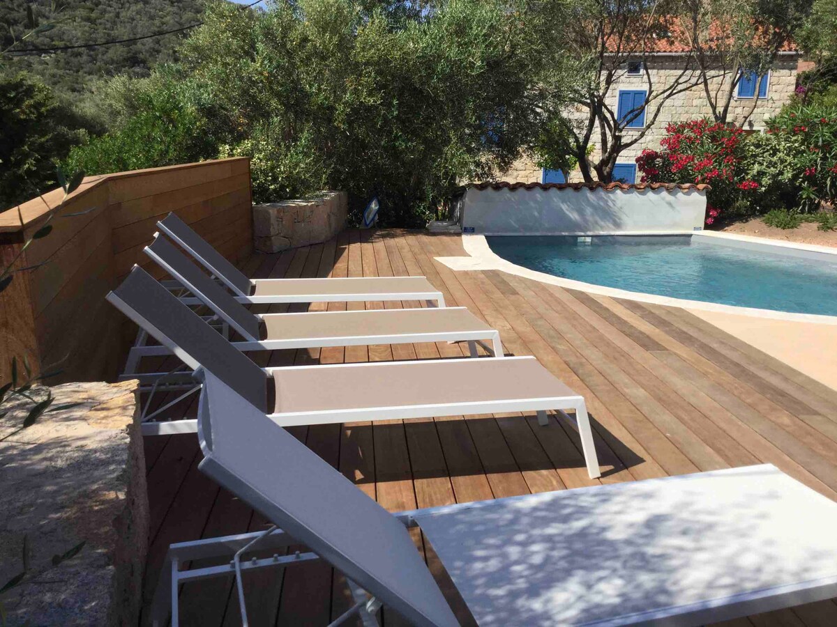 The 200 m2 villa is in a quiet location, yet 5 minutes from the beaches of Bonifacio. Designed to accommodate 4 adults and 4 children or 6 adults and 2 children. The main asset apart from its location are the beautifully landscaped exteriors. The summer kitchen, 40 m2, allows you to live outside from breakfast to dinner. We have also taken great care of the interior decoration making the house contemporary and warm at the same time. The 15/4 m swimming pool is heated. Concierge service possible.