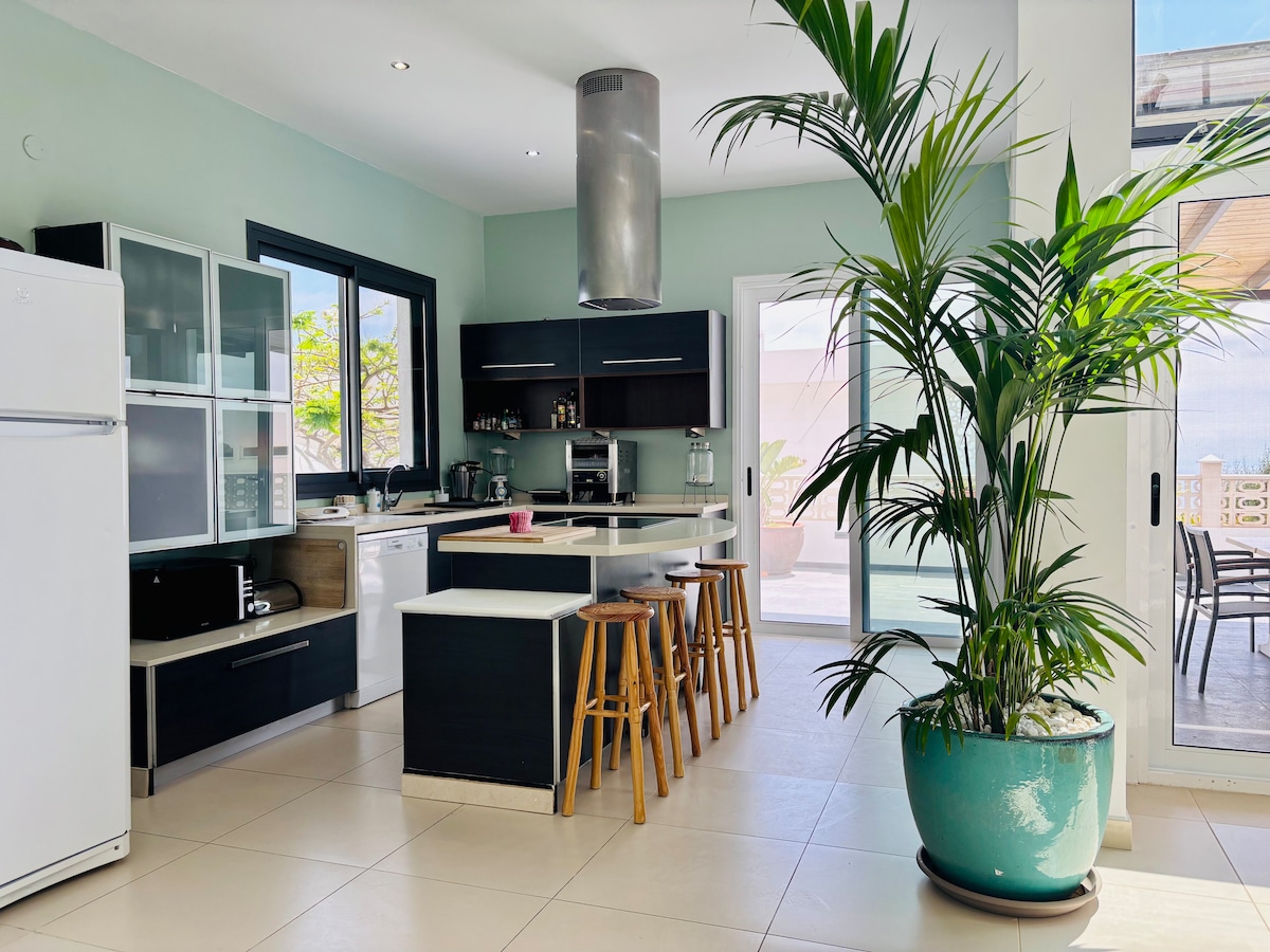 Beautiful modern house! 3 bedrooms, 3 bathrooms, one WC, very big terrace with private heated pool and gardens, magnificent views to the ocean. It is situated just in 7 min walking from the famous Siam Park and a new shopping center Siam Mall. The heating of the swimming pool is 150 euros per a week. We have outdoor camera for security. we´re responsible for ensuring that our listing is safe and compliant with safety regulations.