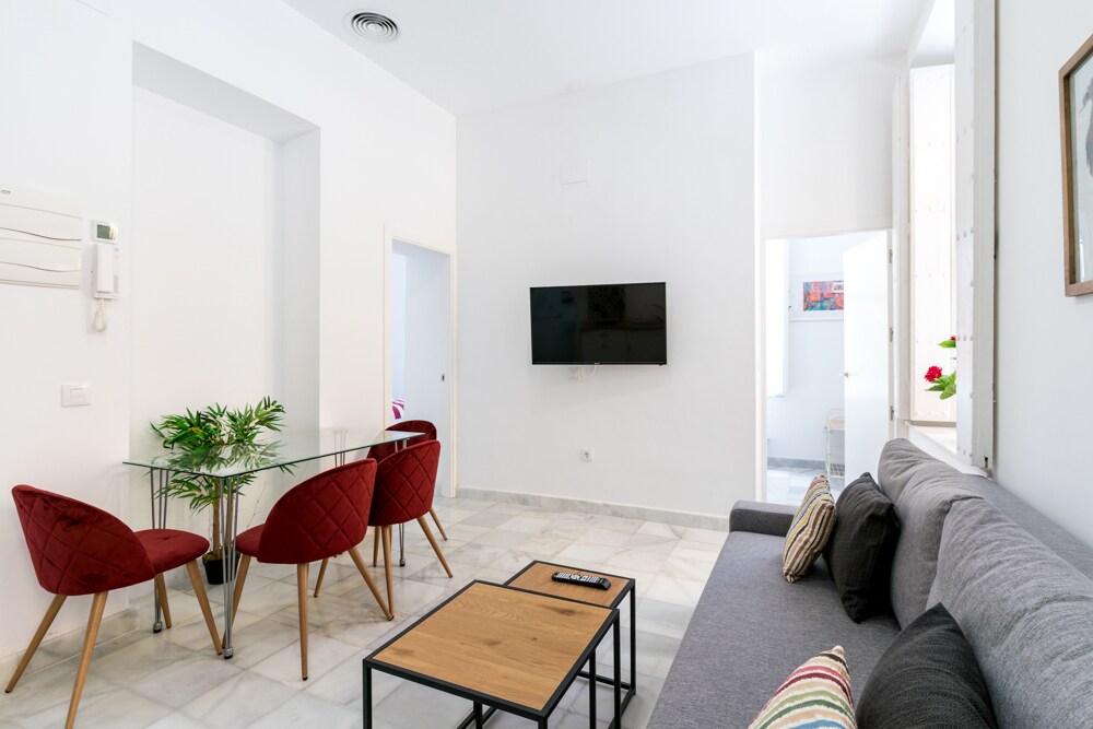 Located in Cádiz, this 50 m² apartment accommodates up to 3 guests and features 1 bedroom, 1 living room, and 1 bathroom. You will have a private, well-equipped kitchen for your convenience. The apartment provides air conditioning and heating in the living room, high-speed Wi-Fi ideal for video calls, TV, washing machine, and a dedicated workspace for remote work.