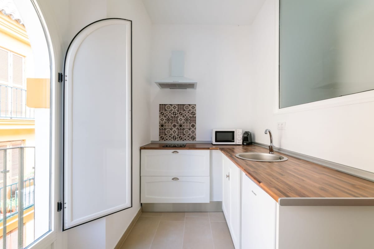 The apartment has: an open plan fitted kitchen, living room with sofa bed and a bedroom with double bed. The bathroom has a shower, hairdryer and towels. The capacity of the apartament is 3 people. The building, totally refurbished respecting its original Andalusian style, with lift and communal terrace with wonderful views of the city. Tourist license: A / SE / 00327