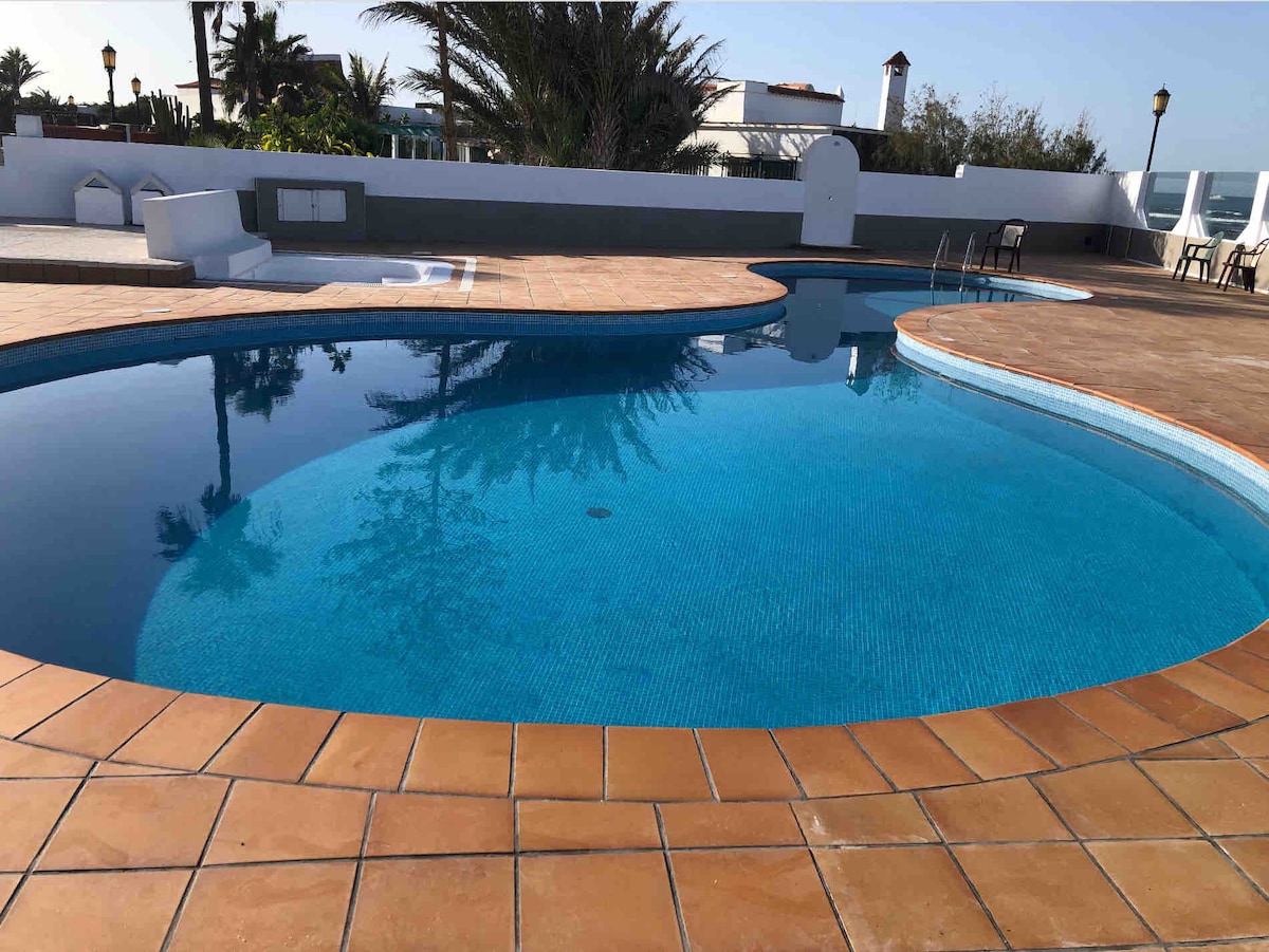 Fully refurbished bungalow boasting a large private roof terrace with sea views of Lobos and Lanzarote. Large quiet communal beachfront pool and paddling pool. (Just fully renovated). Situated within a small gated beachfront complex next to the popular surf spot 'Punta Elena'. We bought this property end september 2021 while it had 114 reviews with an average of 4,87 and hope to even improve this to make your stay a “memorable experience”