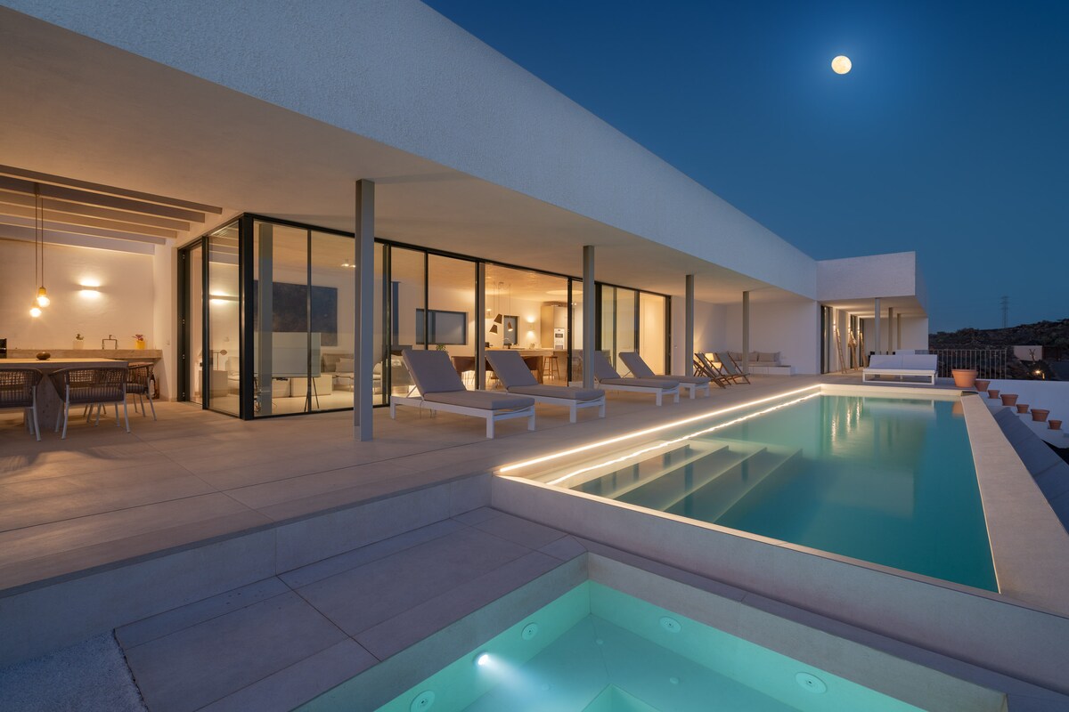 Villas Veaco Bahiazul are luxury villas located in Corralejo (Fuerteventura). Each villa includes three bedrooms and it has a private and heated pool ( with an additional cost) , solarium, barbecue area and jacuzzi. The villas have a fully equipped living room and kitchen , air conditioning and free Wi-Fi. It has also an outdoor parking space at the entrance of the villa.