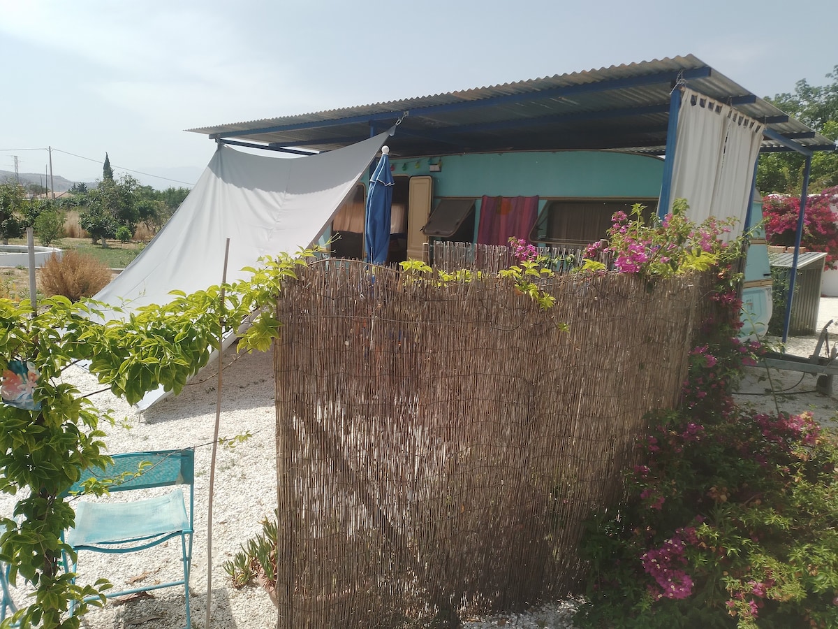 Stick to yourselves – nude or not – or enjoy the company of 2 highly sociable hosts, 2 teens & a bunch of highly human dogs: in a caravan in the garden of our home in the countryside of Almayate at 2,5km from Costa del Sol's only unspoiled beach, half an hour drive from Málaga: Get the best of 2 worlds: camping + the shared access to all commodities incl. pool, huge terrace overlooking the sea, outside kitchen with bbq, covered dining & billiard table on a plot of 5.000m² full of fruits.