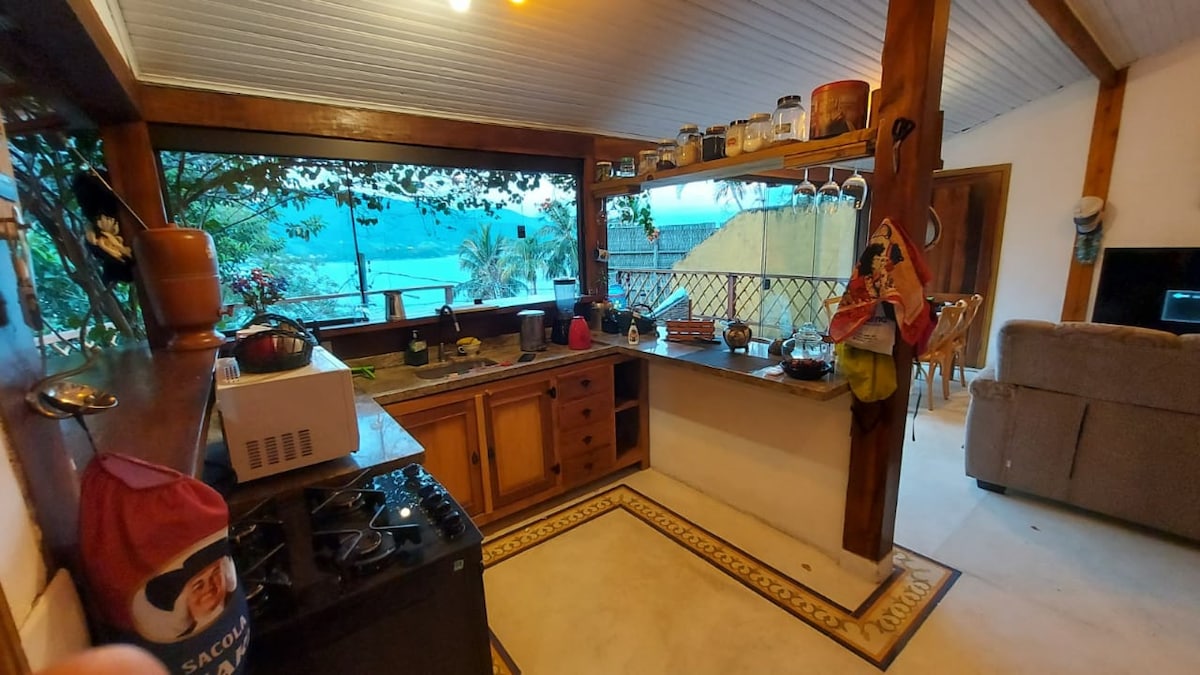 Beautiful house with a privileged view of the sea and a protected beach in the middle of nature. One of the few that has air conditioning. The road ends at the village beach in the middle of local fishing ranches. Access to the house is on foot by the beach, 30 meters 1 double suite (queen bed) 1 single suite -1 bed and mezzanine-3 people 1 double bedroom (queen size bed) 1 bathroom that serves the double bedroom Living room with ocean views Balcony with a view (hooks for 2 hammocks) Parking for 1 car