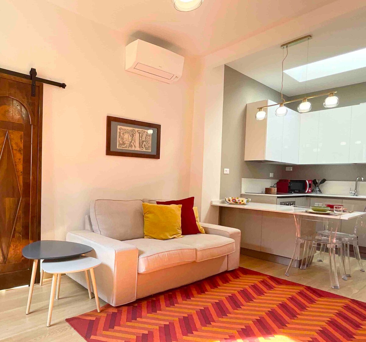 This bright attic is furnished with everything you need for a pleasant stay: a spacious kitchen with cooking utensils, an induction stove, a microwave, a Smart TV, Netflix, Wi-Fi, a Bluetooth speaker, air conditioning, a washing machine, and a comfortable double bed beneath a stunning 12th-century fresco. The entire apartment is available on the third floor (no elevator), in the city's liveliest neighborhood, just five minutes from the subway.