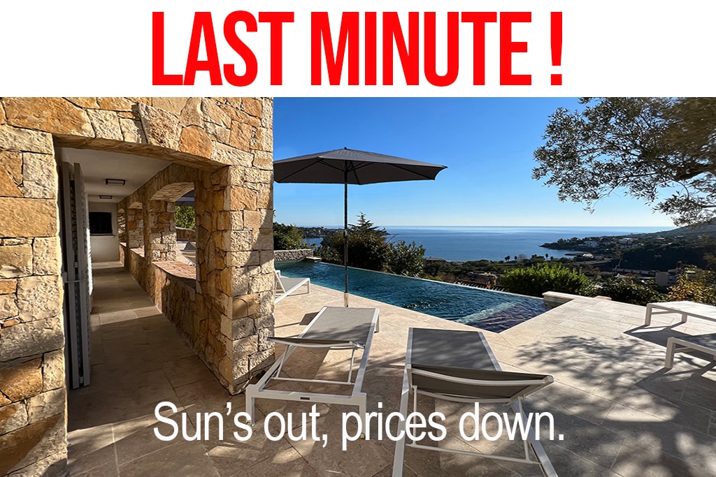 Relax in this beautiful zen villa overlooking the French Riviera in a private fenced garden a walk from the beach in a gated community This 50 sq meter house is fully renovated with large bay window and sea and garden view from every room . It has a separated bedroom with bathroom a fully equiped kitchen with dining area, a living room with sectional sofa a dedicated working area AC, high speed internet access with starlink ,2 large smart TV, washing machine , private parking and storage.