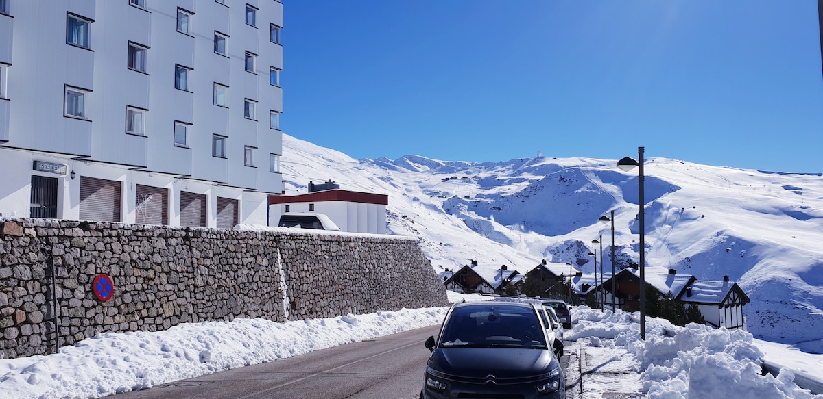 Spectacular apartment with views of the slopes in the lower area of Sierra Nevada, with a parking space, Wi-Fi, Netflix for 6 people. Monte Gorbea building, behind Hotel Meliá, 300 meters from the chairlift The apartment is composed of: living room/kitchen with 1 double sofa, double bed, entrance with 2x80cm bunk bed of 180 cm and bathroom. Garage included. Check-in/check-out is 500 meters walk from the apartment and 4.5 km by car because Sierra Nevada only has one direction