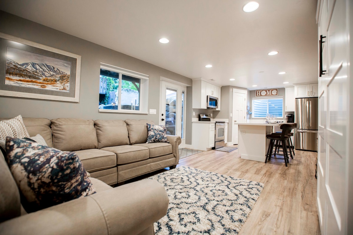 Fantastic two bedroom apartment! Minutes from the world's best skiing! Separate entrance in a single family home! This mother in law style accommodation is very spacious ( 1100 sq ft) and includes two bedrooms with super comfy queen sized mattresses, living room with a large sectional, flatscreen TV, laundry room, bathroom, kitchenette including fridge, microwave, coffee pot, and toaster. We have room for one car in the driveway. 25 min from the Salt Lake International airport.