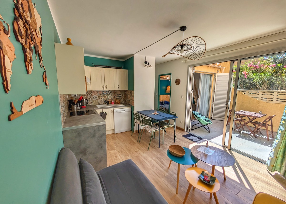 On the ground floor of a wooded residence, this pretty renovated apartment has a private terrace of 10 m², allowing you to dine outdoors and secure your bikes. Lydia beach and its shops are in the immediate vicinity of the residence, Place du Tertre and its restaurants are very close as well as the Pinède for a walk in the shade. Private parking space. Wi-Fi included, smart TV. Towels, sheets and linen are not included.