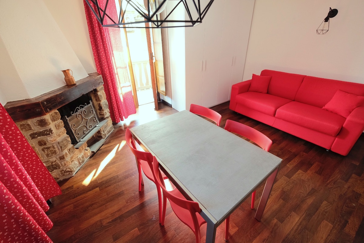 L'Atelier: apartment in typical mountain style, renovation of our Pope's carpentry workshop, where he spent his working days immersed in the scent of wood. Located on the ground floor of the 1800 family home. The apartment accommodates 4 people with 2 double bedrooms and two bathrooms, it can accommodate two more in the double sofa bed in the living room. Spacious living area with kitchenette, dining and living room. Extra bed for children upon request.