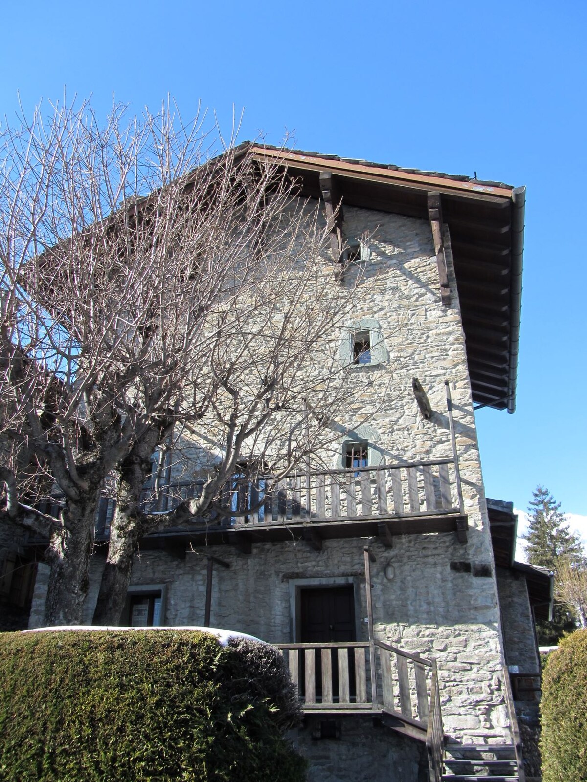 Alps Mountains. Italy. Aosta Valley. A cabin in a small village at 1600 meters,in the peace of meadows, grazing cows and mountains. Snow (usually) in the winter. A place of the heart, lovingly restored preserving the ancient beams of the roof. A wonderful view from the large windows and a special tranquility for those in search of peace, warmth and relaxation. The furniture is very nice: wood above all, but also more lively colors, and modern comforts. Quiet excursions, both on snowshoes or ski.