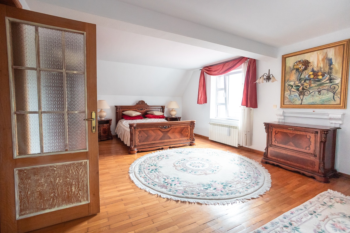 The villa is located in a nice and quiet houses area. Guest's apartment has 110 sq m (4 rooms apartment) and is located at the upper floor of the villa. Highly recommended for families and groups of friends, the location is kids friendly, families are welcome as well as single travelers, couples, groups of friends or business travelers. Free parking spots are available in front of the entrance. Access to public transport: 10 minutes walking distance to bus stations.