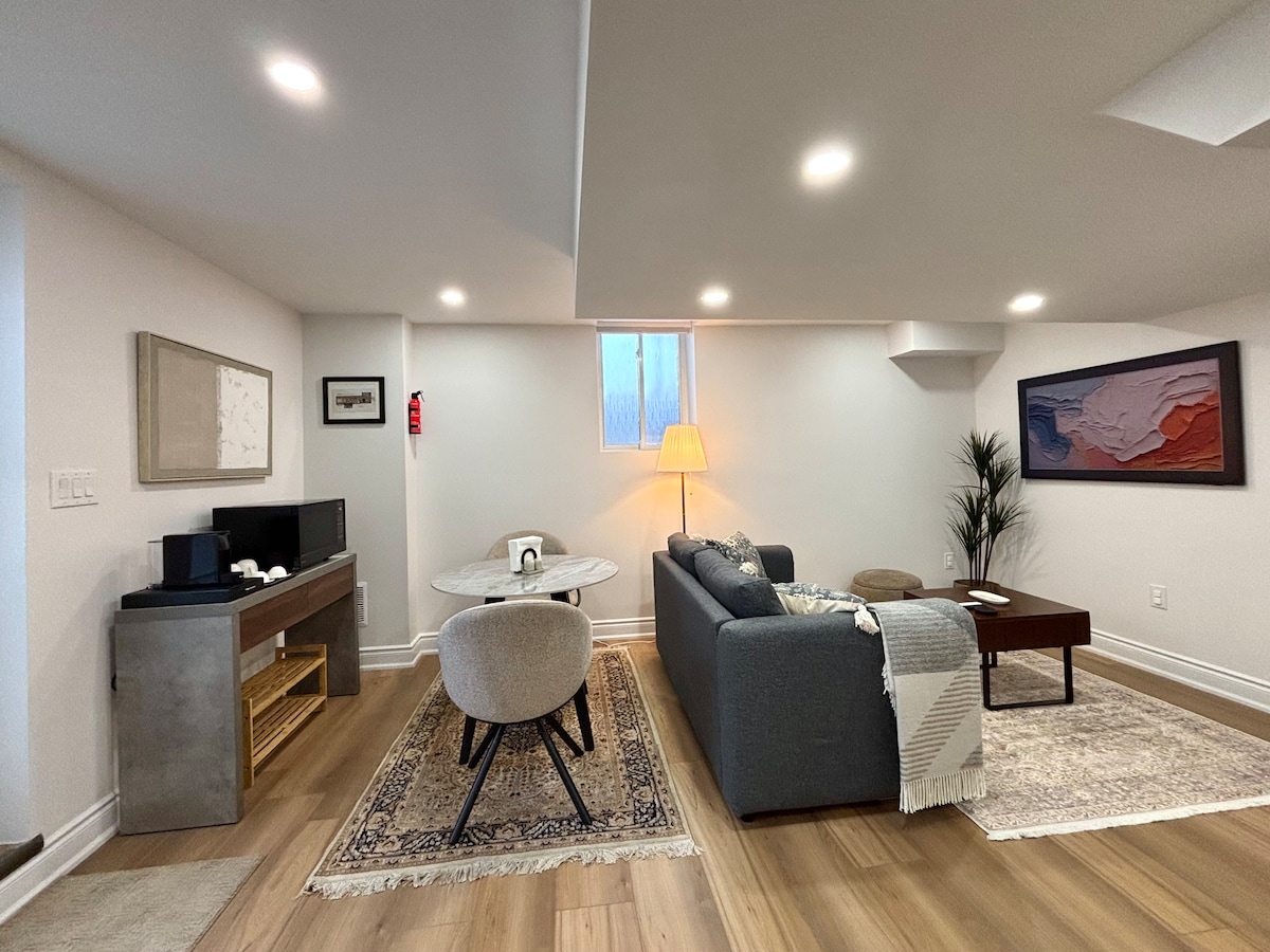 You will love this one bedroom self-contained unit with separated entrance near Square One mall in downtown Mississauga and 15 minutes to Pearson Airport, easy access to highway 401 and highway 403 and close to all amenities. Modern design bright & spacious with beautiful and private view. Enjoy with free high speed Wi-Fi & 43" tv Netflix available, one parking spot side by side , all included. Quiet neighborhood. - Sorry No party, No smoking, Filming nor Event Stay.