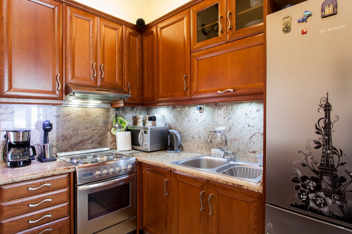 Charming, sunny, confortable, 2level 1-bedroom flat with a balcony in a quiet neighborhood. On lower level, the living room, sofa bed (125X200cm), dinning table, kitchen, bathroom and furnished balcony. On Upper level is the bedroom with a confortable bed(160X200cm). Free street parking is found. Sandy beach, City center, Museums, Old Town, central bus station, shopping area, are located at less than 3-8 min walking distance. It's suitable for couples, families and groups of 3.