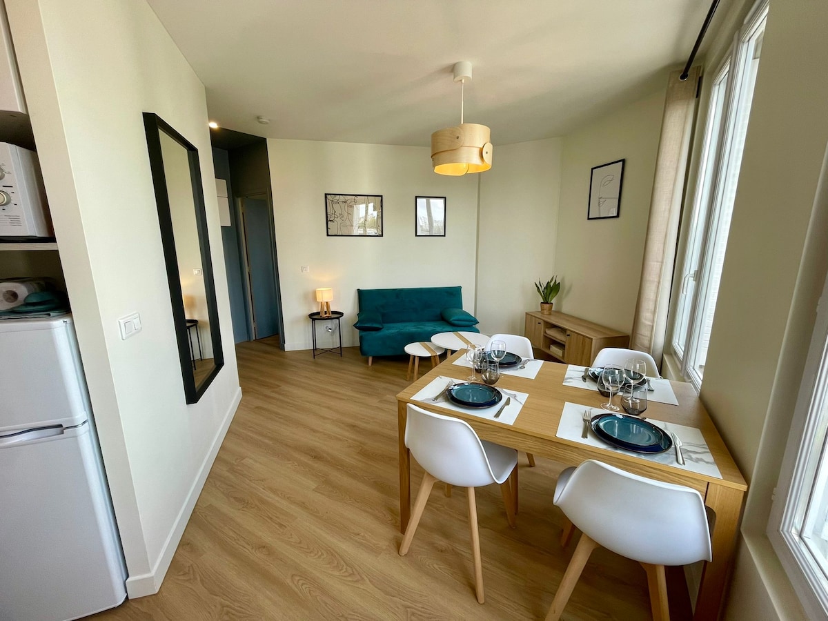 Charming apartment in Vitry-sur-Seine, ideal for a couple. It offers a bedroom with queen size bed, a bright living room with equipped open kitchen and a modern bathroom. Located in a quiet condominium, it enjoys views of the Seine and the Eiffel Tower in the distance. Just over a 5-minute walk to the RER C, it allows quick access to Paris while offering the tranquility of a residential area with all amenities nearby. Great for a romantic stay on the outskirts of Paris.