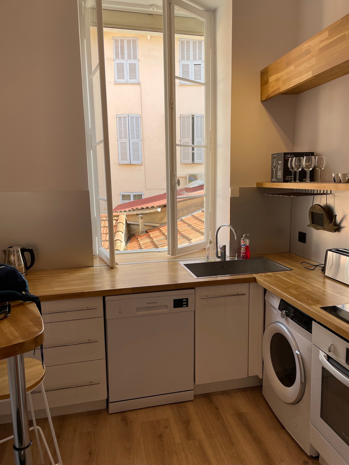Night corner with double bed. Living room with sofa bed 140 cm. Bathroom with shower, washing machine. Kitchenette Wi fi. Climatisé. All linen is provided. Umbrella bed loan, baby bath and chair on request free of charge. Possibility to accommodate 2 more people on request. N tariff surcharge for children. It is located 700 m from the festival and beach palace. 500 m from the Cannes train station and 300 m from the Forville market and the Suquet parking private