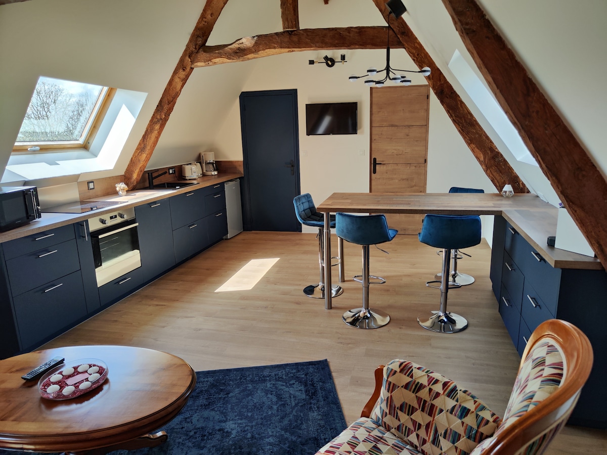 On the first floor of our family manor house, immerse yourself in the authentic charm of a 50 m² apartment steeped in history. With its period moldings and warm atmosphere, it's the perfect base for exploring the region year-round. You'll find a fully equipped kitchen, a comfortable living room, and all the amenities for a truly delightful stay.