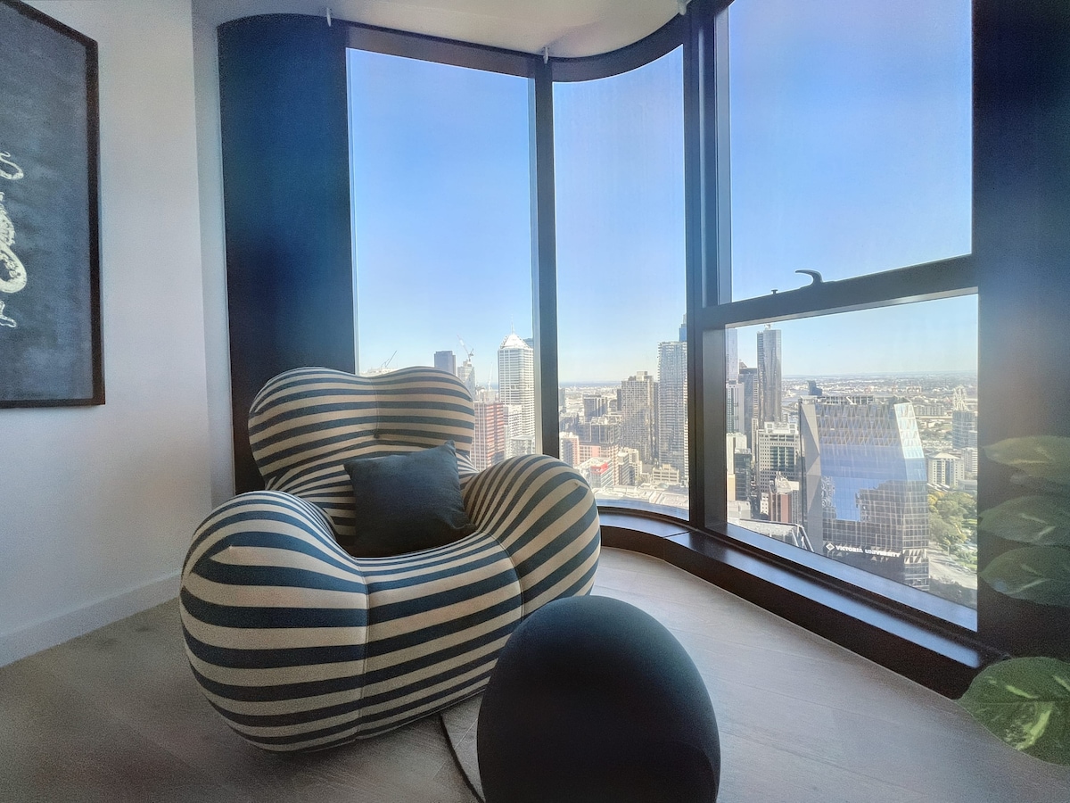 Our place is on Collins Street(near William St) opposite Intercontinental Hotel and new W hotel. High In The Sky: This fabulous apartment on the 45th floor in the ‘New York’ end of Collins street offers exceptional city and bay views as well as superb location. The apartment is decorated in a chic New York style and offers a warm retreat after busy shopping or entertaining in the world class Collins street. Open the blinds to embrace the moon and stars at night and the sunrise in the morning.
