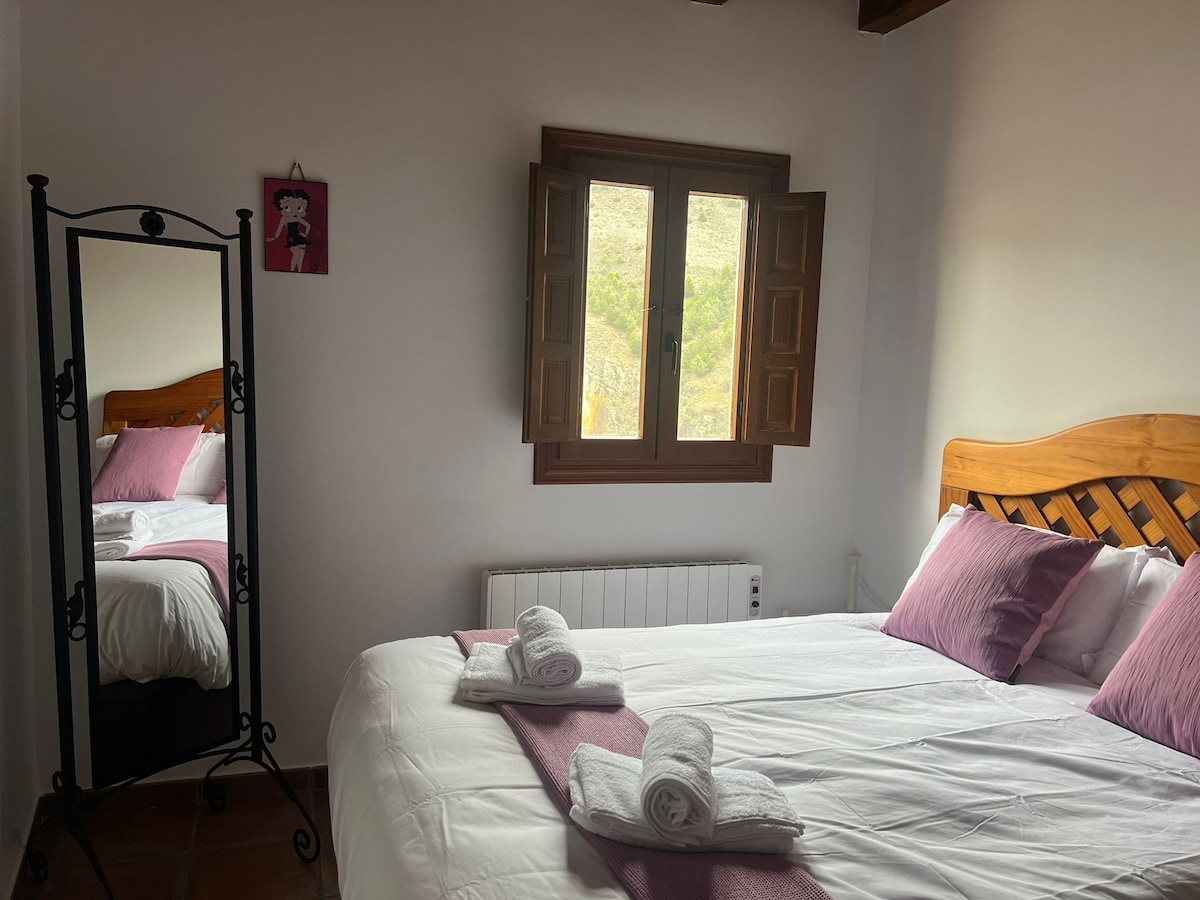 This stunning 94 m2 accommodation with exposed beam ceiling It has a large living-dining room and a fully-equipped kitchen. It has two bedrooms, one of which has a double bed and an en-suite bathroom and views of the Hoz del Huécar; and the other is a very large room with two 90 cm single beds. The accommodation also has a second full bathroom for our guests' privacy.