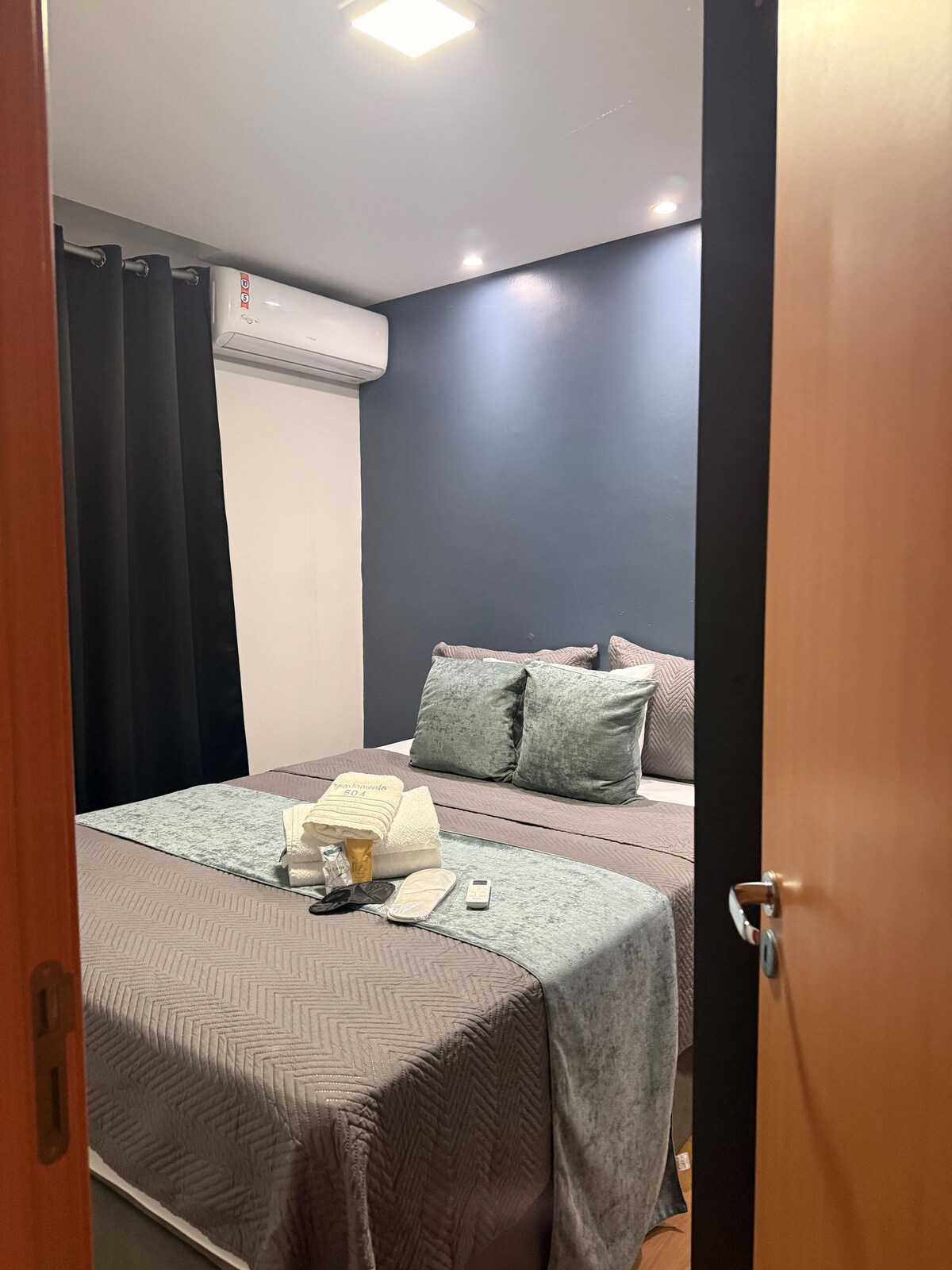 Very well cleaned, cozy apartment with a queen-size bed and split air-conditioning, living room with smart TV, Netflix and reclining sofa, Wi-Fi, full kitchen with duplex refrigerator, stove, coffee maker, pots, cutlery, balcony with washing machine and clothes dryer, very safe, with covered garage, quiet and a few meters from a bakery, market, butcher shop, very well located, with a swimming pool and 24-hour electronic concierge.