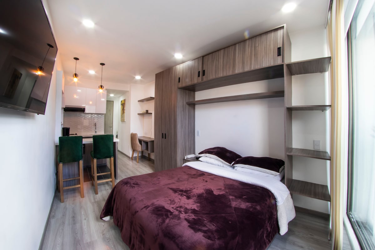 Fully equipped Studio Apartment, Entry with smart digital lock. 24-hour surveillance and reception. Wifi and Netflix service to make you feel at home. Located in Chapinero, an extra-strategic area of the city with easy public transportation, close to academic centers, supermarkets, financial areas, shopping centers, tourist sites, El Campin stadium, Movitsar Arena and a high demand for gastronomy. Also for an additional value, it surprises with a nice decoration.
