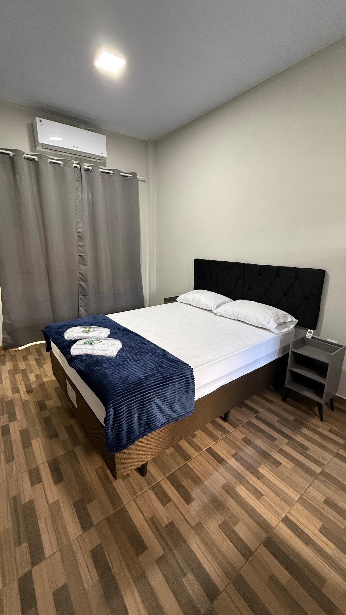 O quarto aconchegante é ideal para pernoite de ate 3 hóspede, oferecendo ar condicionado, uma cama de casal e uma cama de solteiro acomoda ate 3 hospedes , TV, banheiro completo, mesa, pia de mármore,armário,Wi-Fi e uma vaga de garagem nao coberta.