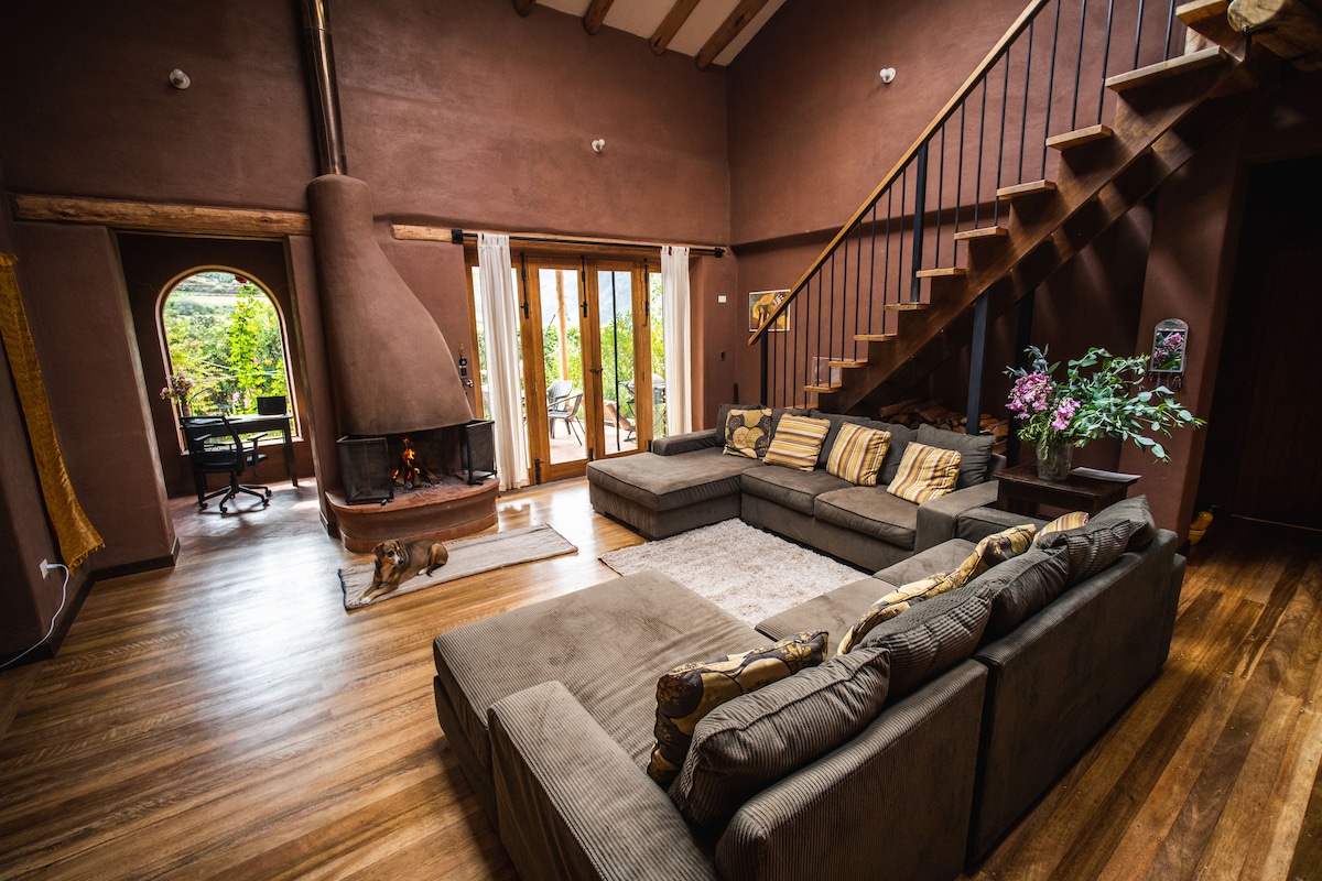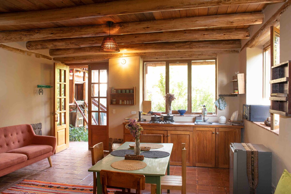 New, spacious and bright eco-friendly house. Located in the heart of the Sacred Valley, 5 minutes from downtown Urubamba and 20 minutes from Ollanta. Surrounded by mountains and with a stream that passes through the property. King size bed, space for yoga or work, balcony and solar hot water in kitchen, bathroom and shower. Ideal for reconnecting with nature without sacrificing comfort. Made with love, designed for your well-being. We look forward to seeing you!