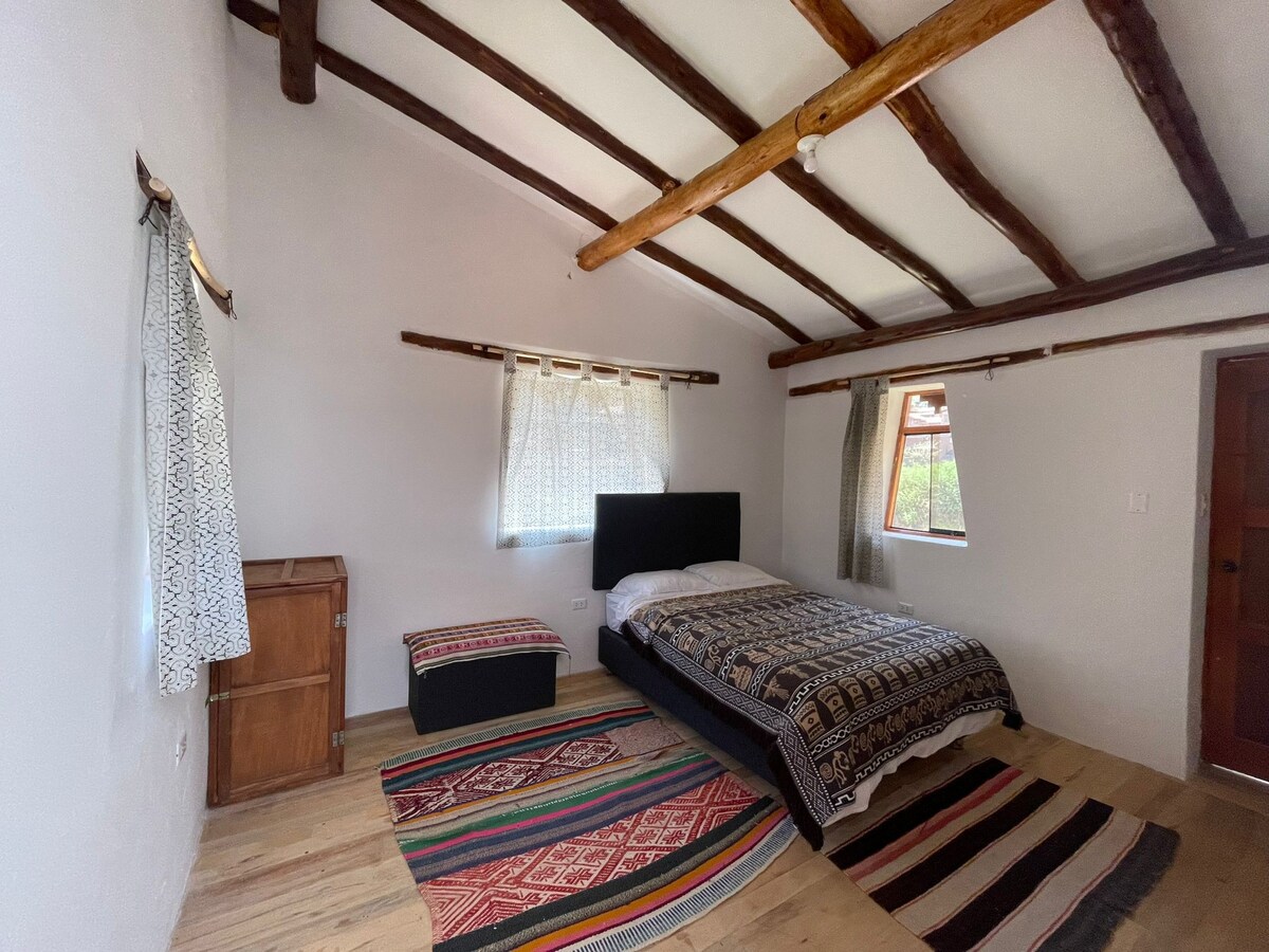 Beautiful private 2 bedroom house, each room with a full bed with a great view. Peaceful place about 15 min walk (4 min moto-taxi) from Pisac downtown. There are nature views and a great space to relax while you have everything close to enjoy your stay as restaurants and crafts markets in city center. The house is located in Rinconada neighborhood. The house is built in adobe material with natural wood floors and low beds that put you in touch with your essence. Pin: -13.421653, -71.838446