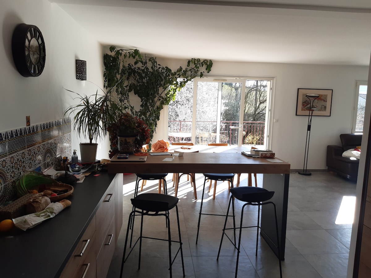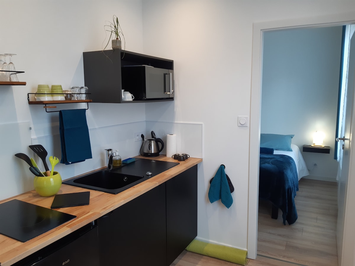 Enjoy a stylish home ideally located, two minutes walk from all amenities (bakeries, supermarket, pizzeria, tobacco shops, bars...). Our furnished tourist accommodation is on the 1st floor of a house composed of 2 furnished tourist accommodations (Le Jaguar upstairs and Les Amandiers on the ground floor). It has an equipped kitchen open to the living room with smart TV and Wi-Fi, a bedroom composed of a 160 x 200 bed (Emma mattress) with shower, sink and individual toilet accessible from the bedroom. 1 Folding bed 90 x 200 cm