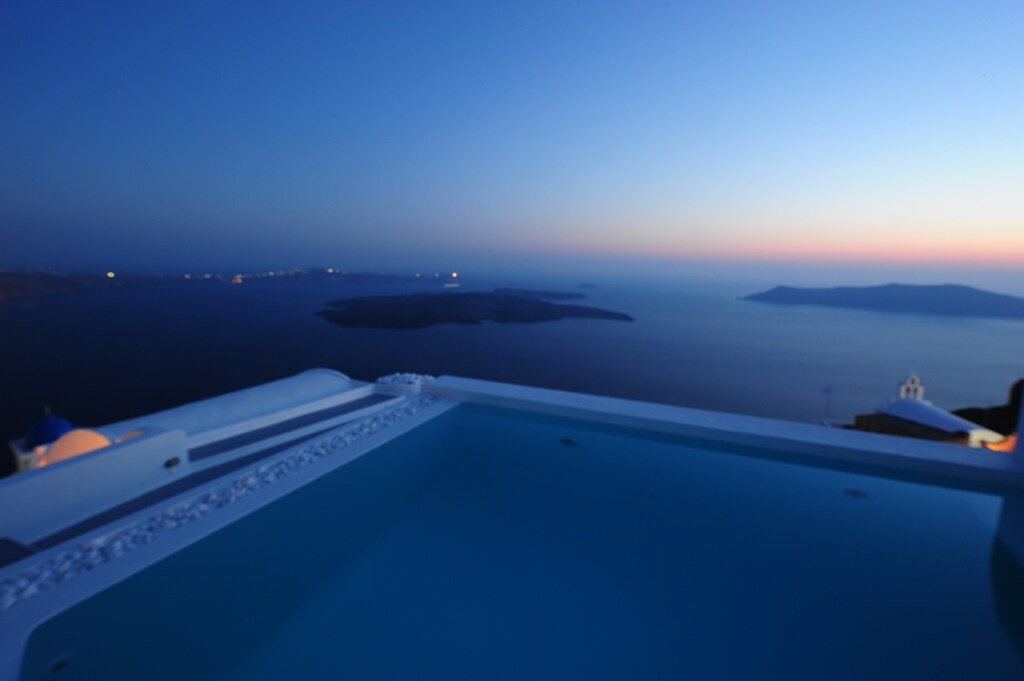 It is a small luxury hotel. It has only five private suites with private bathrooms. Each suite has its private balcony, private outside hot tub and amazing views to the volcano and sunset. The hotel is located in the heart of Fira. Very close to the hotel is the central bus station, the main square. We are here to welcome you if you are looking for a calm, quiet, private suite with amazing views.