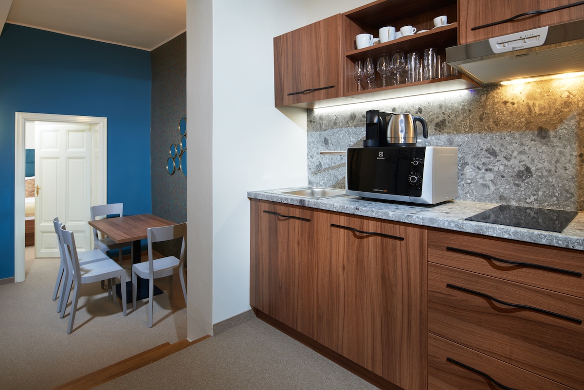 2-Room Suite in the City Centre, next to Wenceslas Square and a step away from the Main Train Station. Perfect for families or a group of friends It sleeps up to 4 guests in a Double Room with a King Size Bed (can be turned into 2 single beds at your request) and 2 Single Beds on a separate room. The Suite features air-conditioning, free wi-fi, in-room safe, television, mini-fridge, tea, & coffee, shelves & hangers, bathroom with bathtub, toiletries, towels & hairdryer.