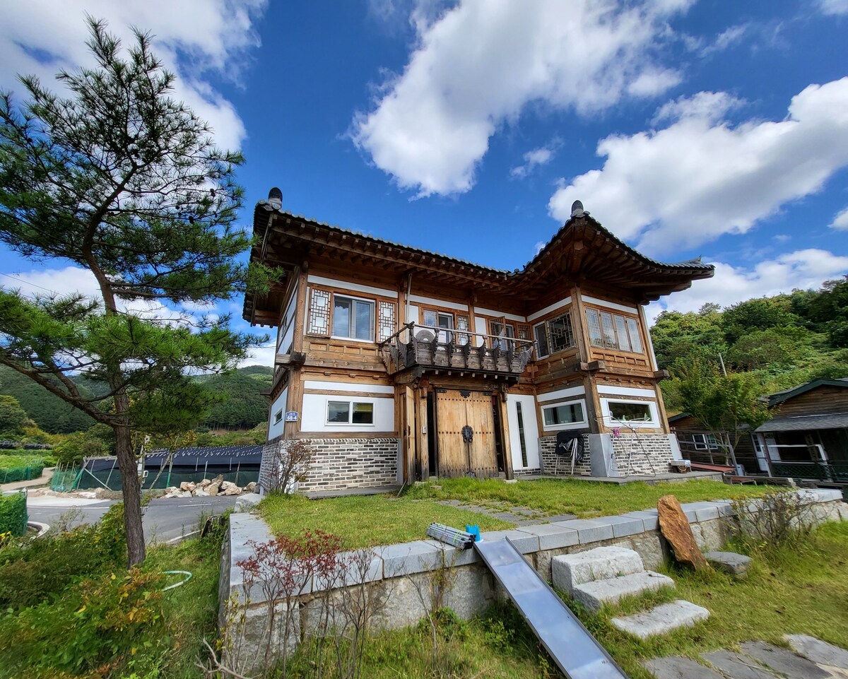 This place is suitable for untact travel. It is a space where you can be freed from the daily routine and the suffocating life of the city center. All you can meet is the sound of the mountain wind, the song of the birds, and the warm hearts of the family. Anyone can travel without being conscious. It consists of 2 rooms, a living room, a kitchen, and a bathroom, and has a large balcony with an unobstructed view. The large room has 2 queen beds, and the small room has 1 queen bed and a single sofa bed. The property is located on the mountain pass near the Unilam and Banilam Valley, and is a quiet place with no private houses nearby. There is a large stream right in front of the house. It's great for playing in the water. The yard of the house is a 300-pyeong lawn garden, the inside of the house is 25 pyeong in size, and there is also a 5-pyeong balcony. It's not a fancy place, but it's a place where you can get plenty of the host's kindness and the scent of nature. If you want to have a comfortable mind through relaxation, come. You will be satisfied.