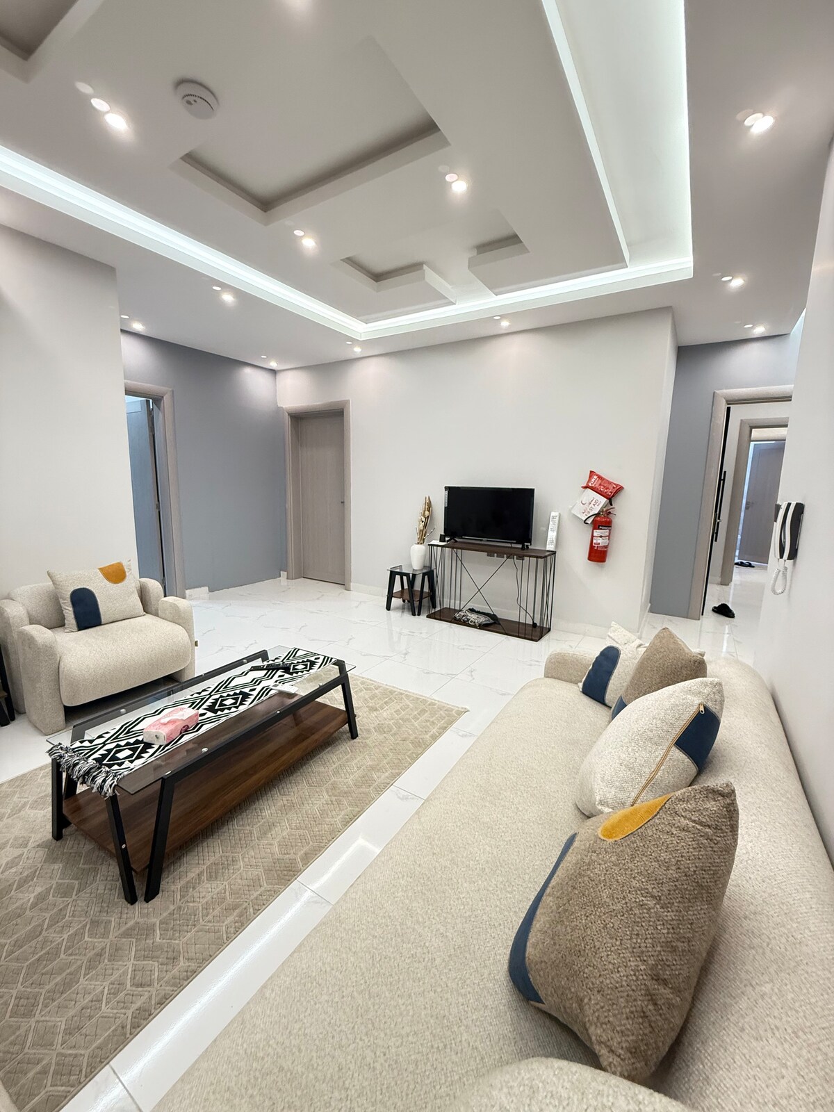 Self-entering apartment in a quiet and clean building located in the north of Jazan city, close to the northern Corniche and Jazan University in a privileged and lively location. It has a spacious living room with a 65-inch smart TV and open fast internet, a kitchen with an oven, microwave, kettle, coffee table, simple cooking utensils, ironing, washing machine on demand and a dryer. It has two bedrooms, one master and one twin. A bathroom. Distance from: Corniche (3 minutes), Jazan Center (5 minutes), Airport (10 minutes), Al Rashed Mall and Kadi (7 minutes)