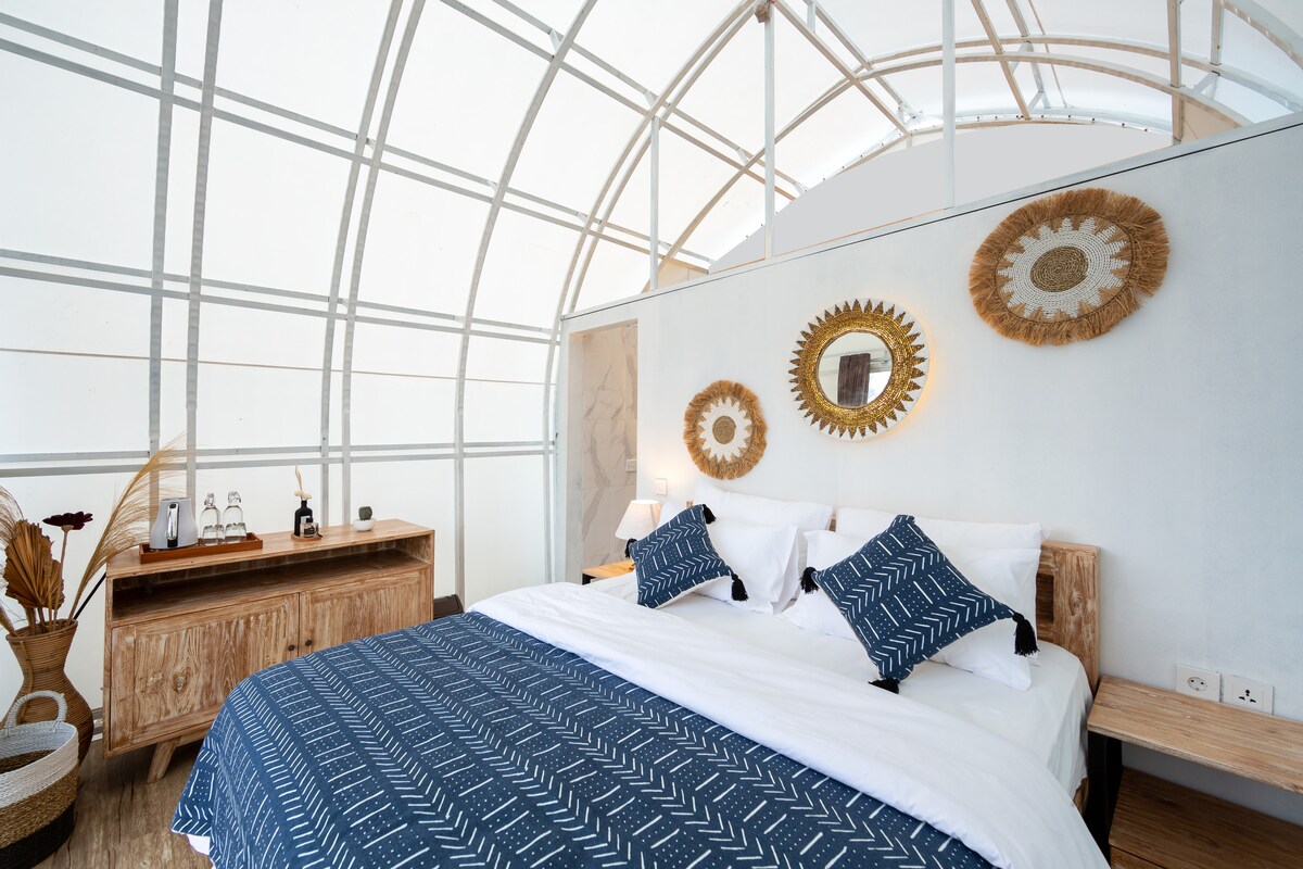 The New of luxury pool tent room in Sidemen offers a premium glamping experience with a modern design. Featuring a spacious king-size bed, this tent provides a comfortable and private retreat surrounded by nature. Enjoy your own private pool while taking in the beautiful views of the rice fields or garden. The tent's design combines luxury and simplicity, providing a tranquil environment to relax and unwind.