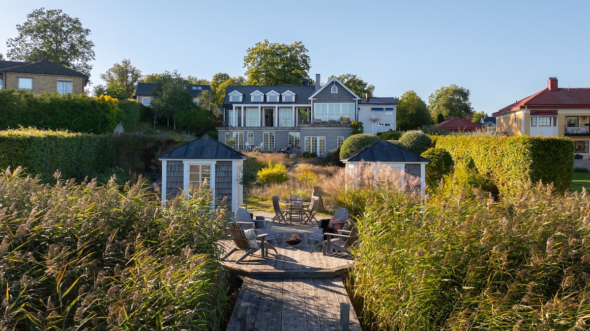 A unique summer oasis by the water! Enjoy breakfast on the terrace overlooking Stocksundet, lazy days in the lush garden, and evenings by the private jetty. You will stay in a spacious, private area of the villa, measuring approximately 200 square metres and spread over two floors. Spacious living areas, a fully equipped kitchen, a gym and a music room. Relaxation in a setting close to the archipelago. A building of cultural and historical value, with a documented history and a unique location by Stocksundet. The perfect accommodation for a large family/group.